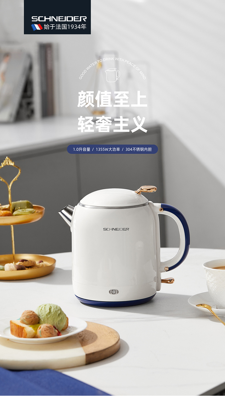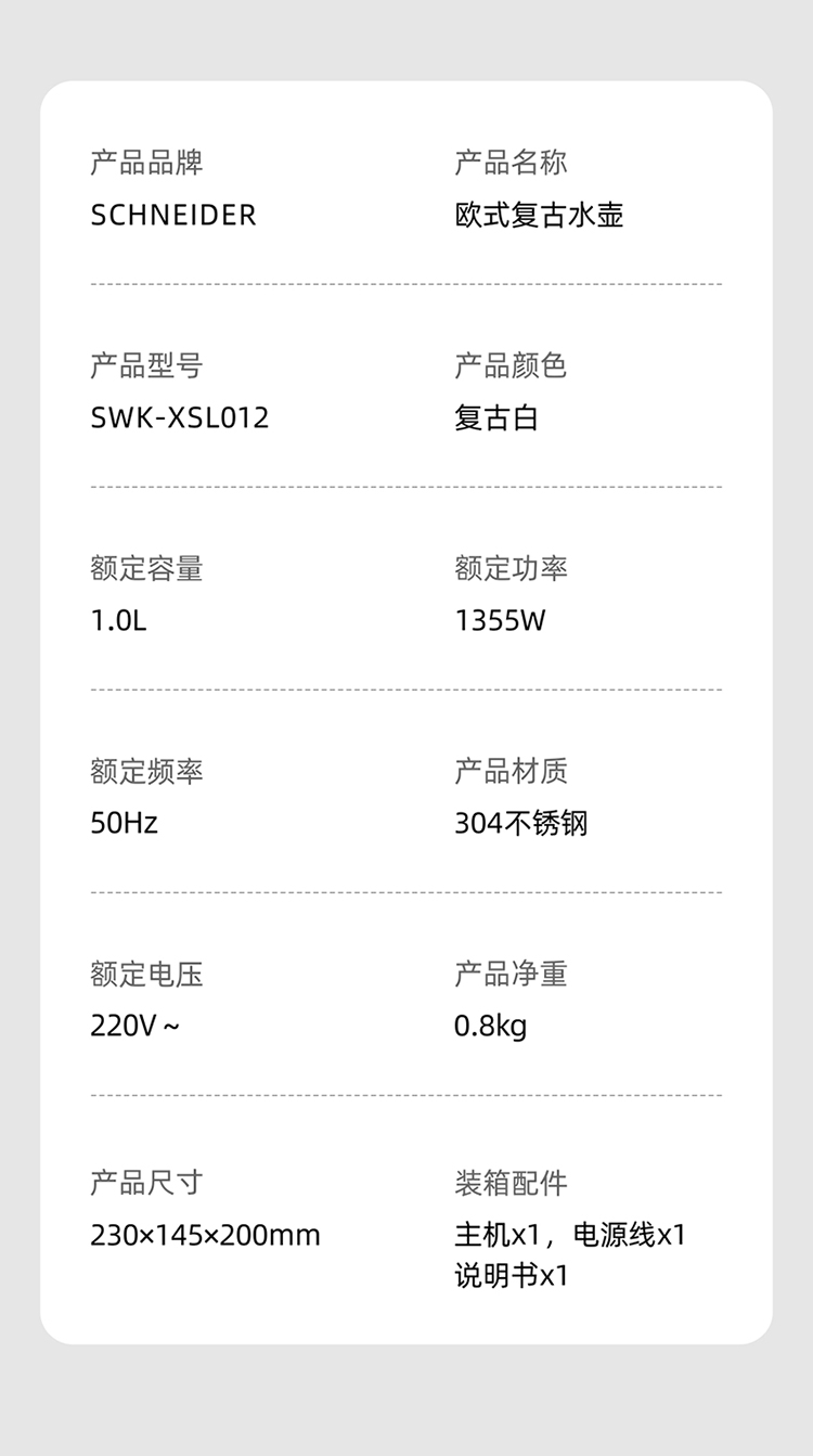 施耐德(SCHNEIDER) 欧式复古水壶 SWK-XSL012 1.0L 白色(单位:台)