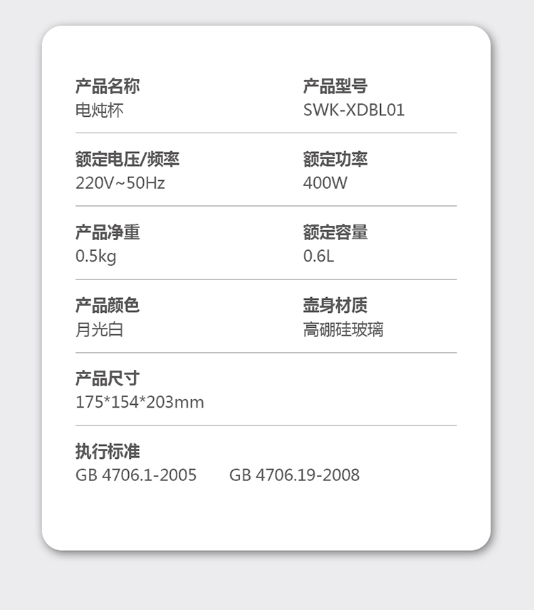 施耐德(SCHNEIDER) 电炖杯 SWK-XDBL01 0.6L 月光白(单位:台)