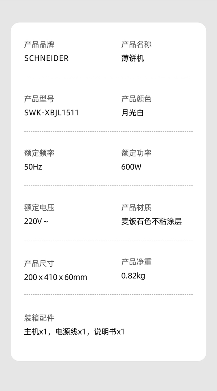 施耐德(SCHNEIDER) 薄饼机 SWK-XBJL1511 600W 月光白(单位:台)