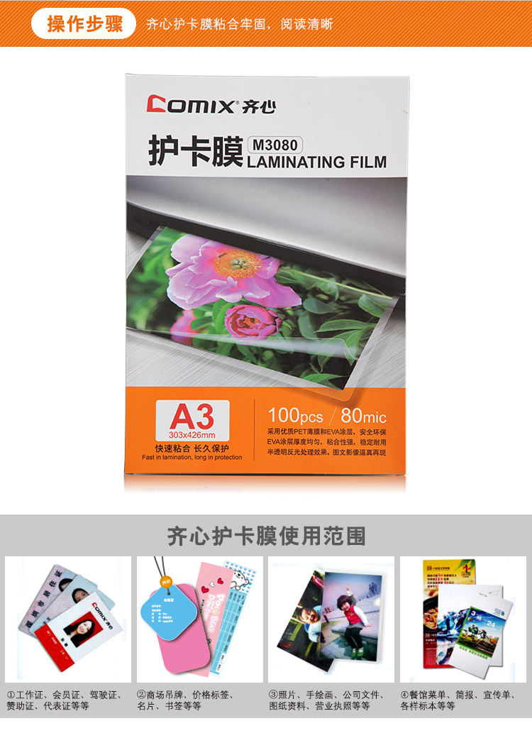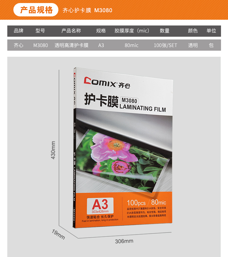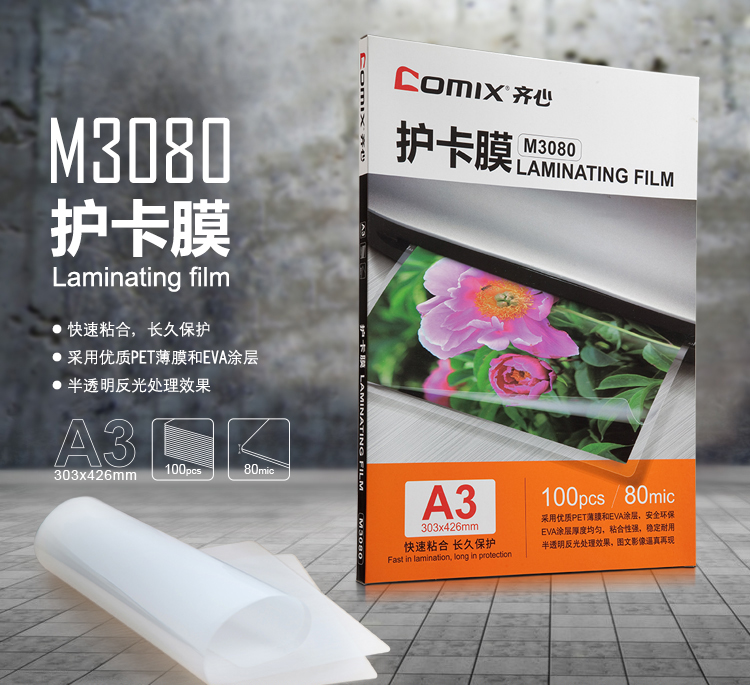 齐心(COMIX) 高清护卡膜 M3080 A380mic100张/包 透明(单位:包)