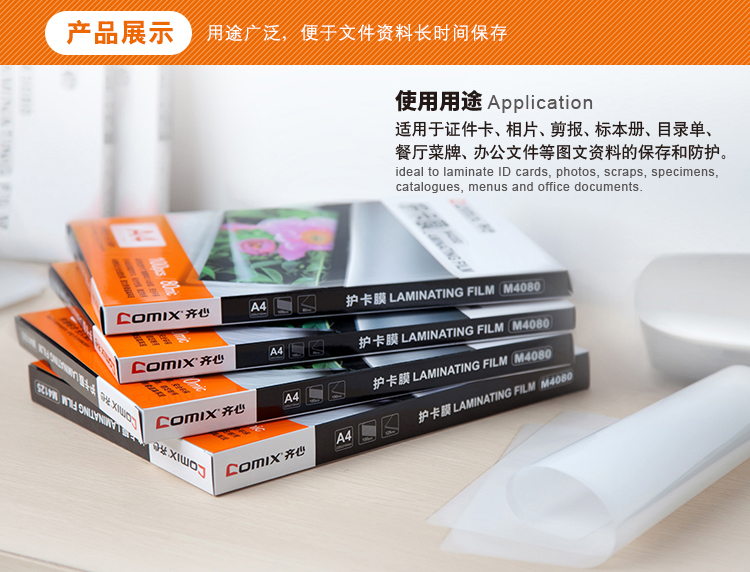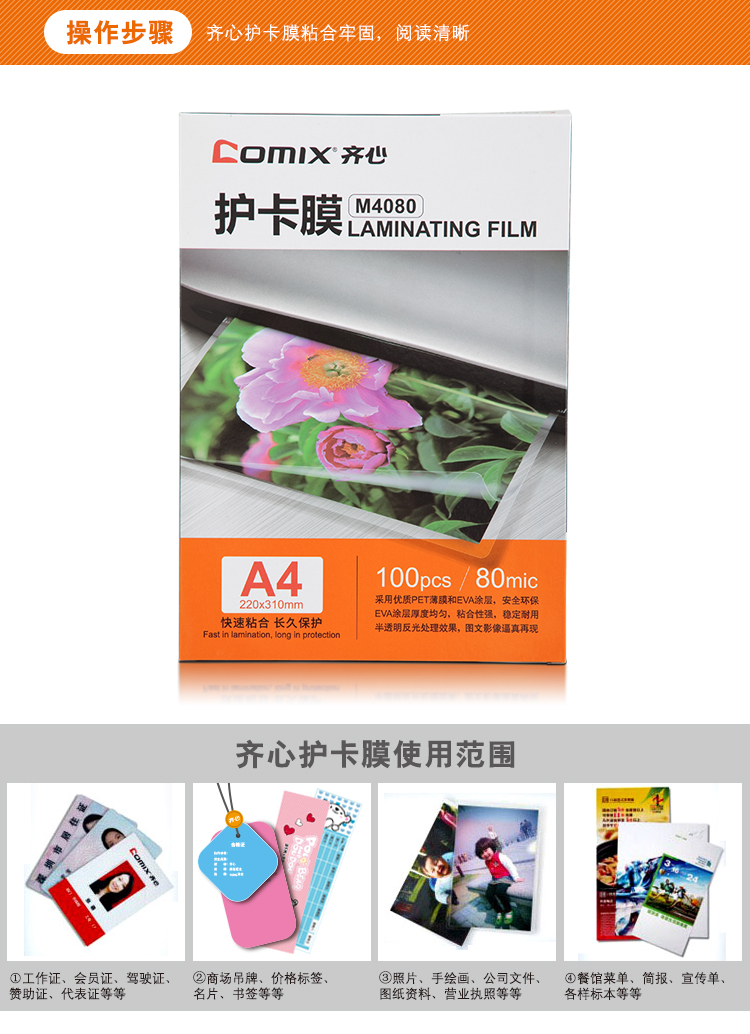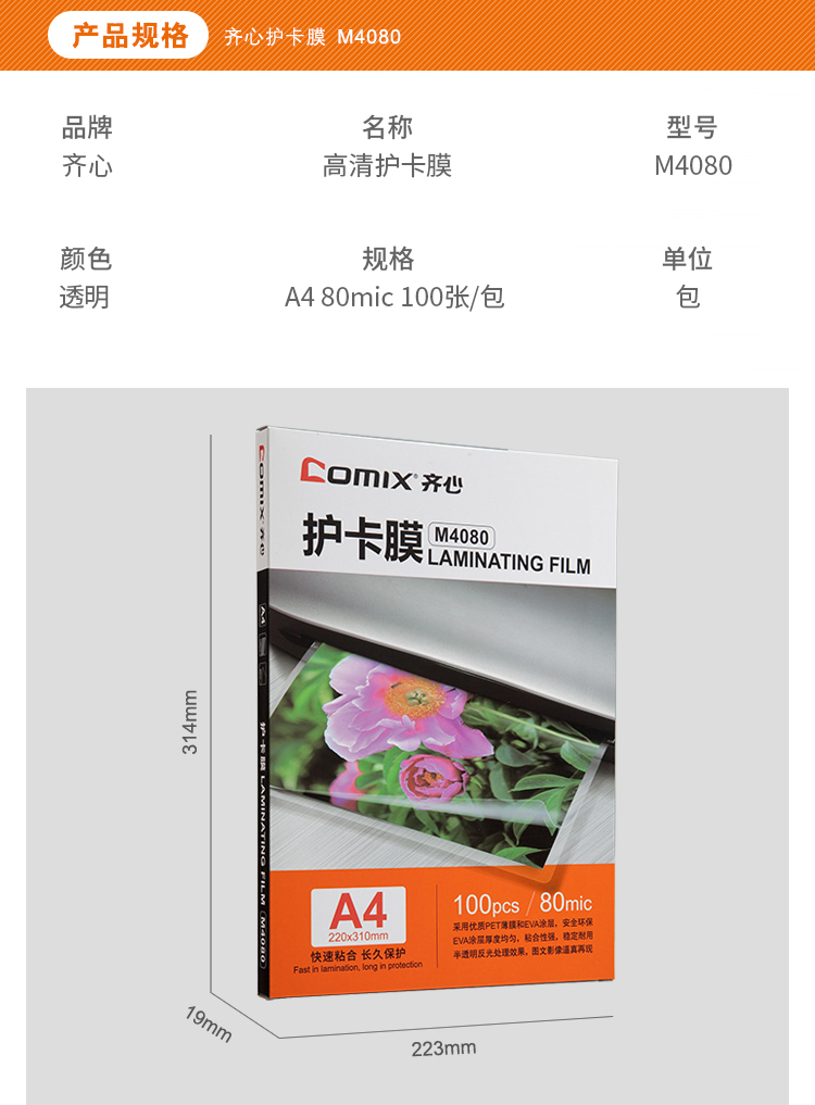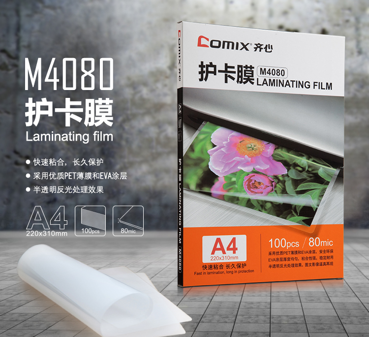 齐心(COMIX) 高清护卡膜 M4080 A480mic100张/包 透明(单位:包)