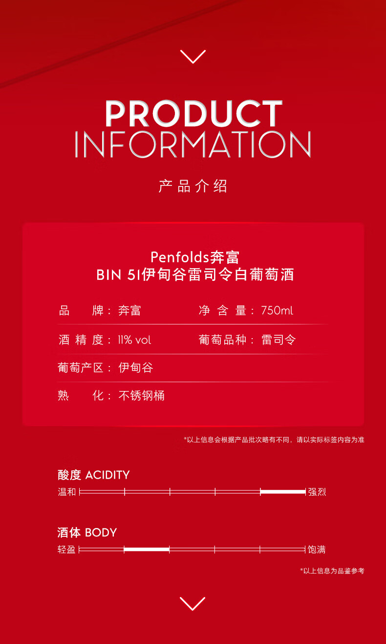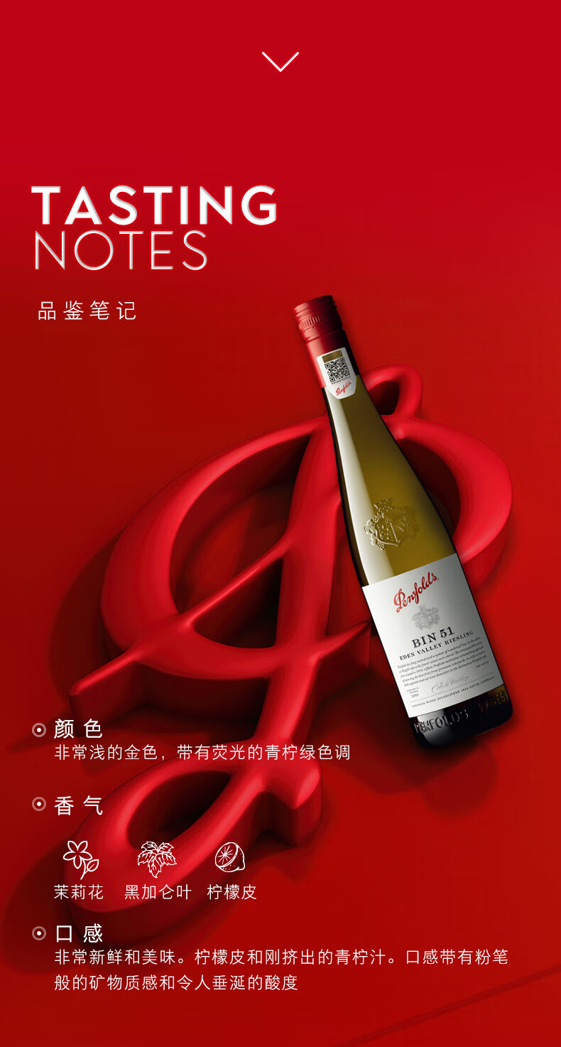奔富 BIN51 伊甸谷雷司令 白葡萄酒 750ml*1 白色(单位:瓶)