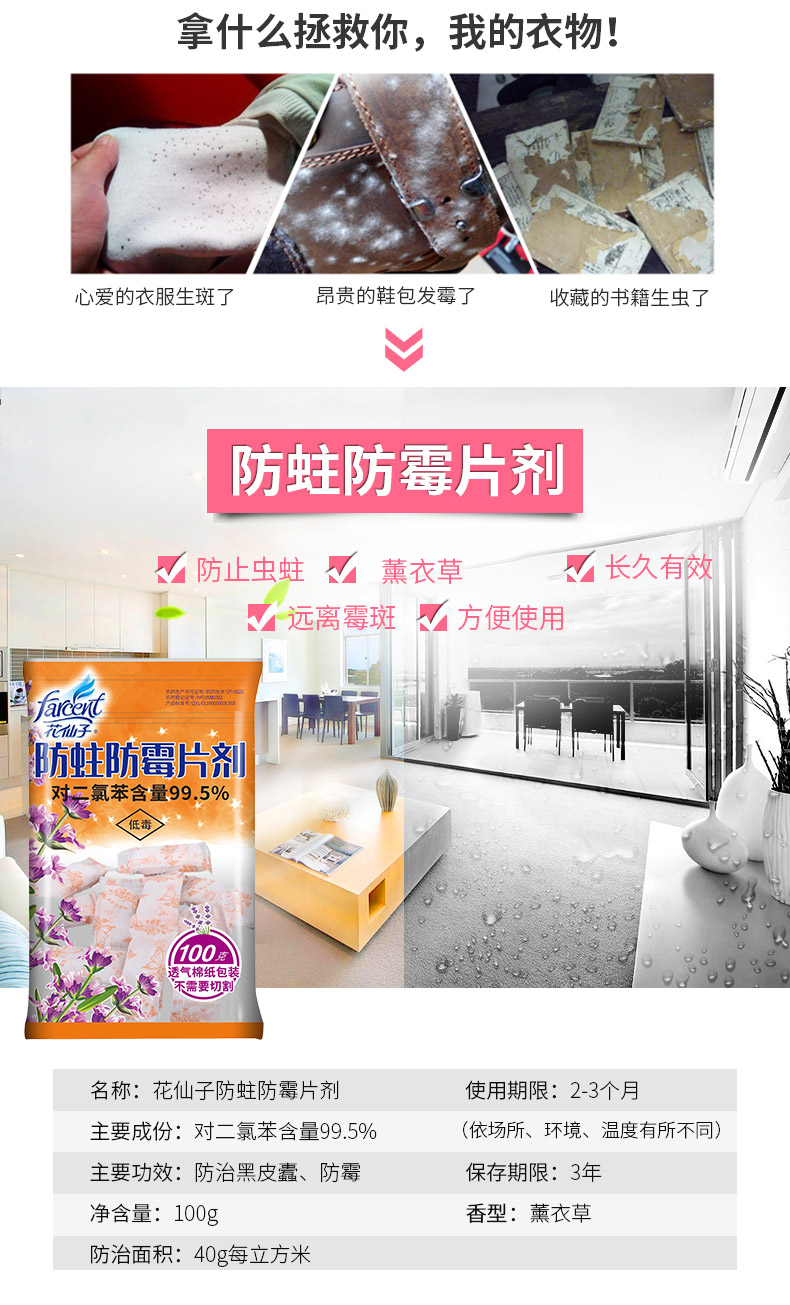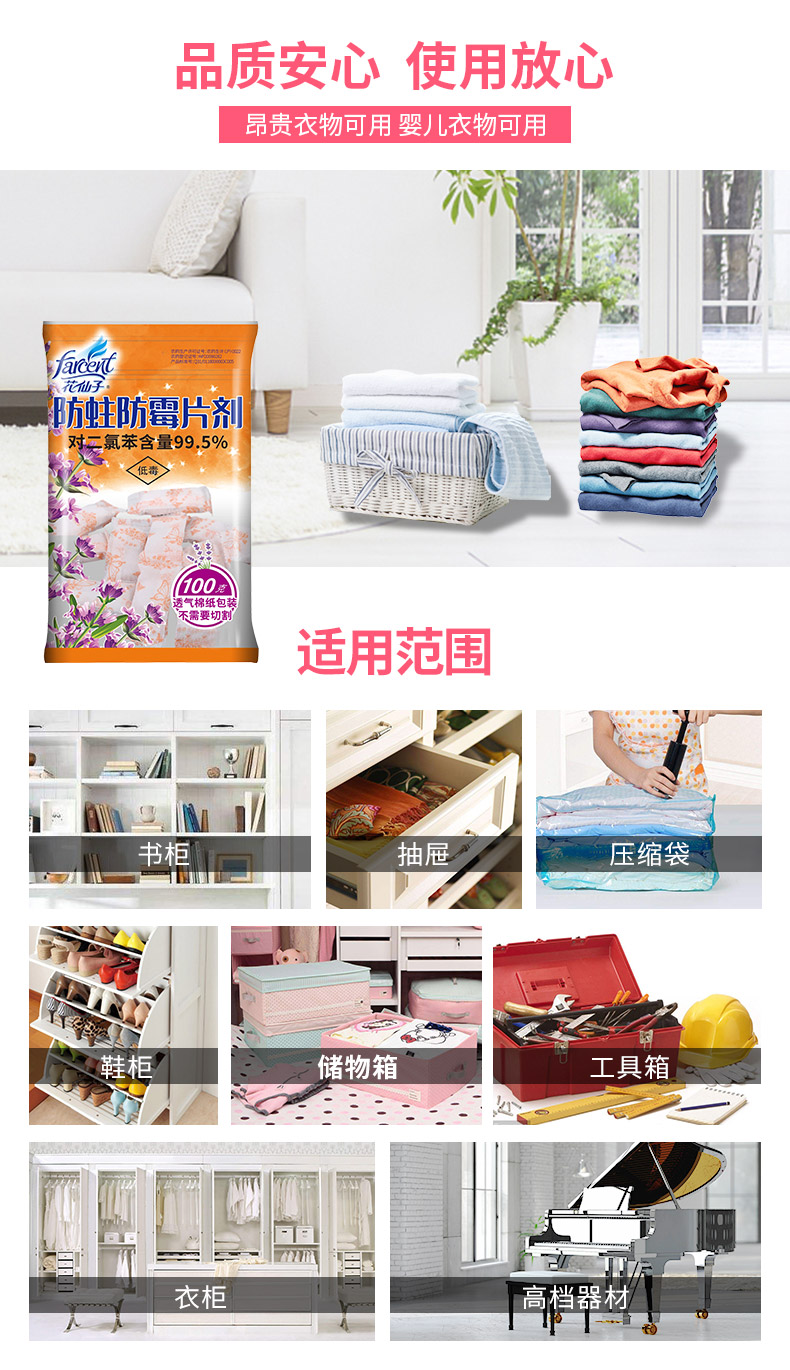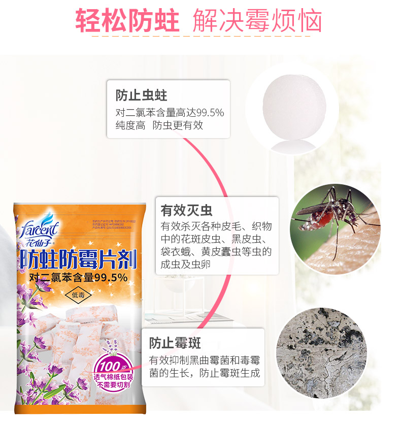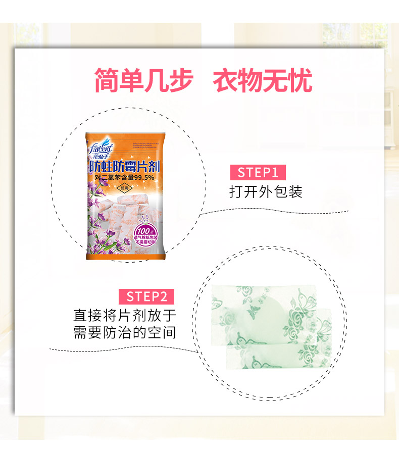 花仙子(Farcent) 防蛀防霉衣橱防虫防蛀樟脑衣柜防霉剂 薰衣草味3入装 100g*3包 混色(单位:组)