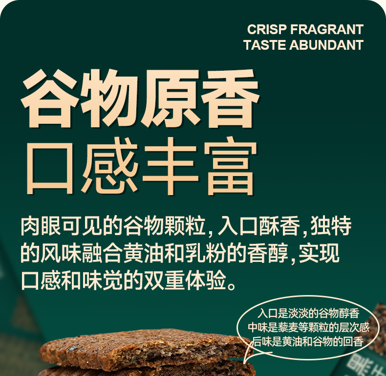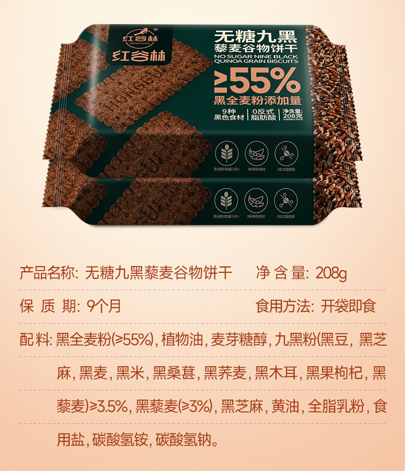 红谷林 无糖全麦早餐粗粮藜麦谷物饼干 9黑 208g*3袋 黑色(单位:组)