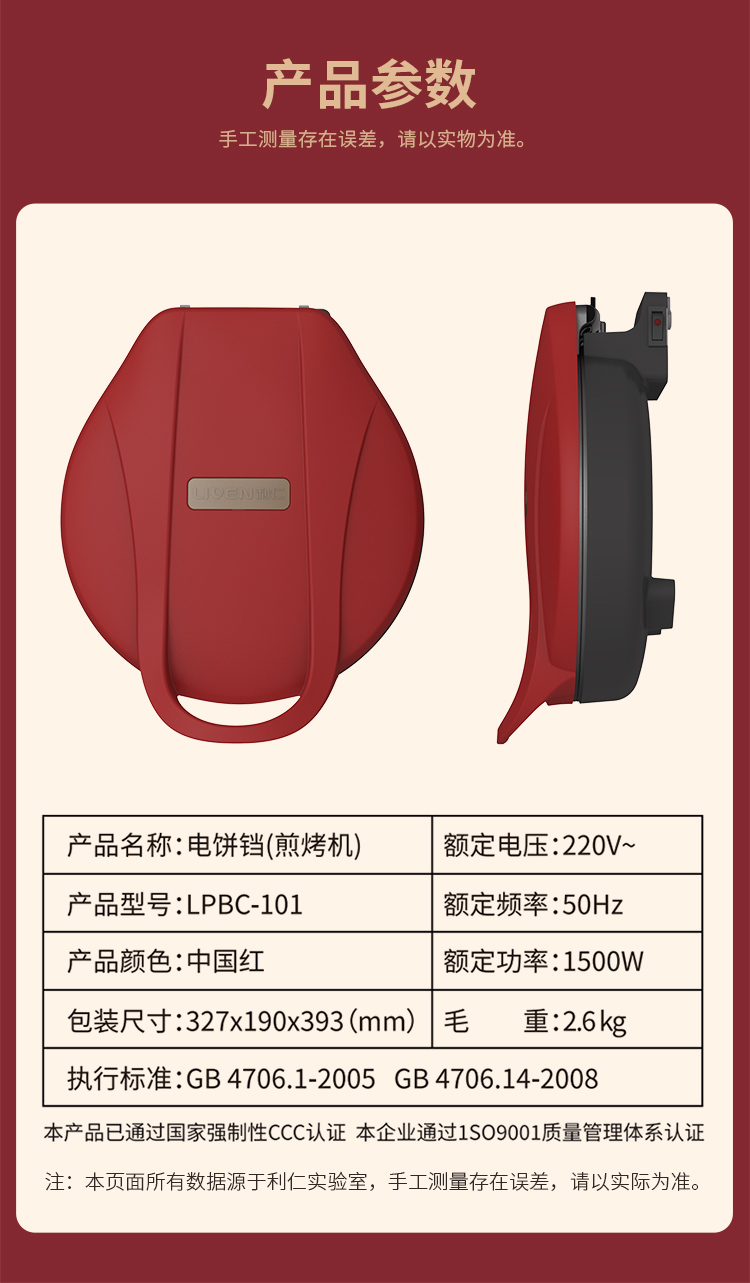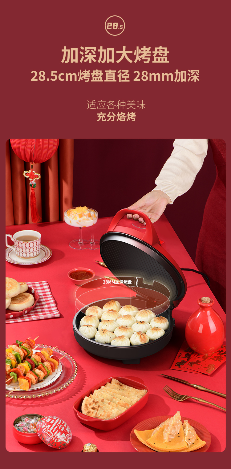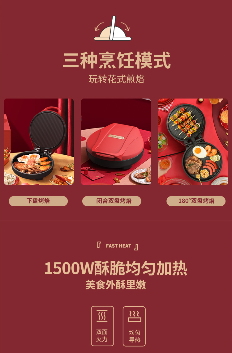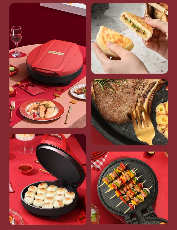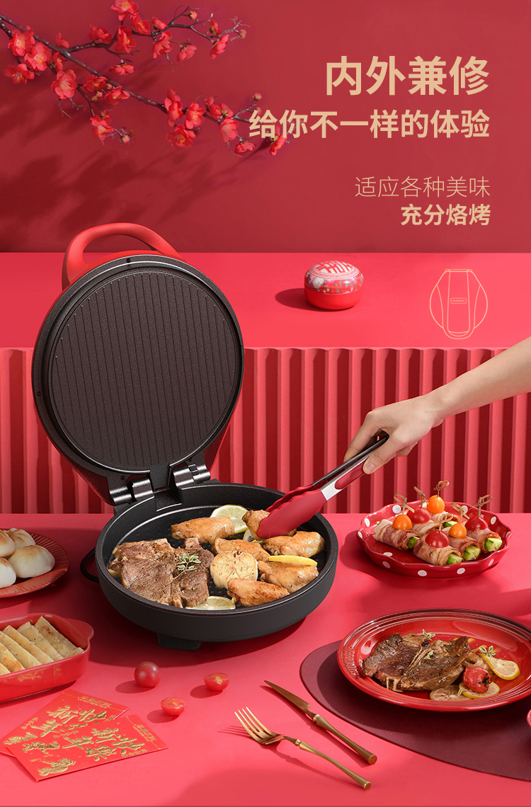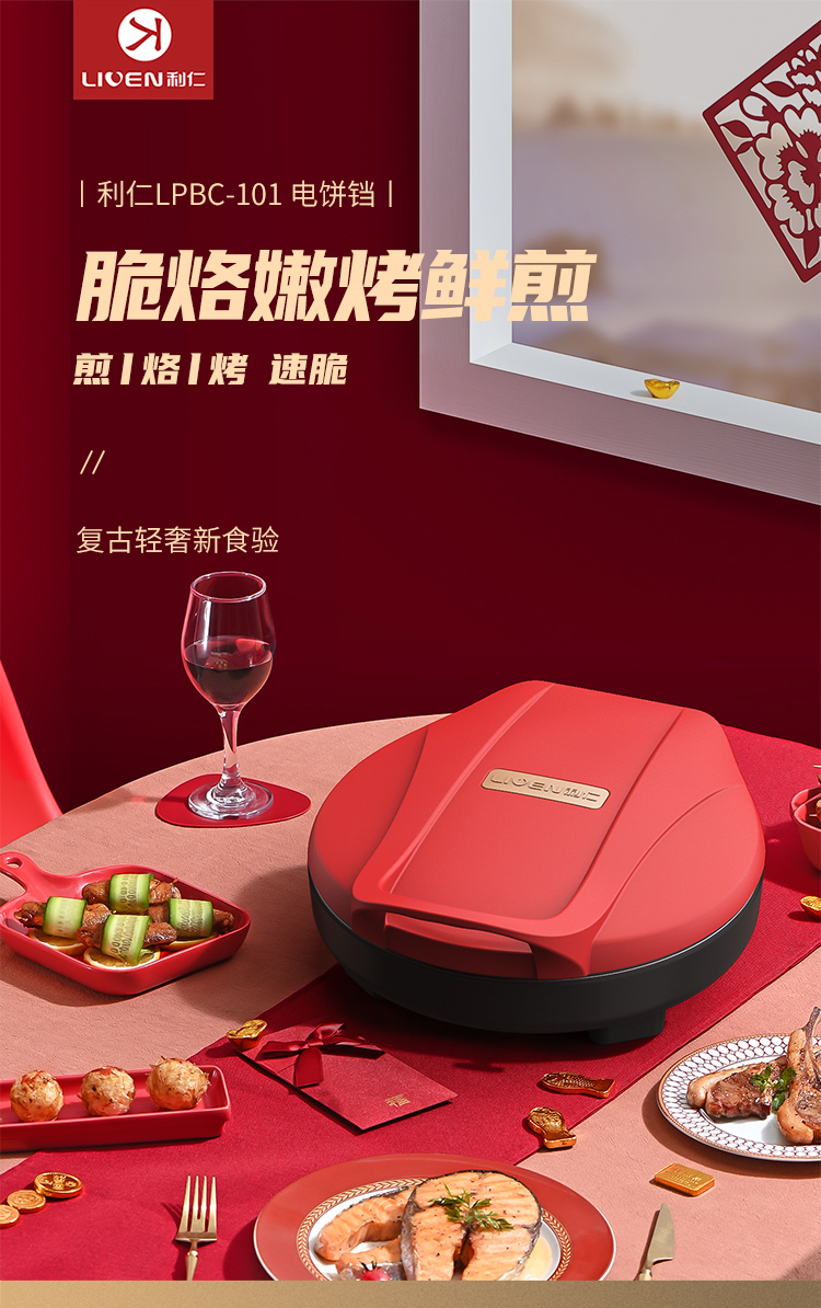 利仁(Liven) 家用双面加热深烤盘大火力烙饼锅煎饼锅煎烤机电饼档 LPBC-101红色 中国红