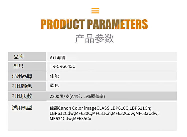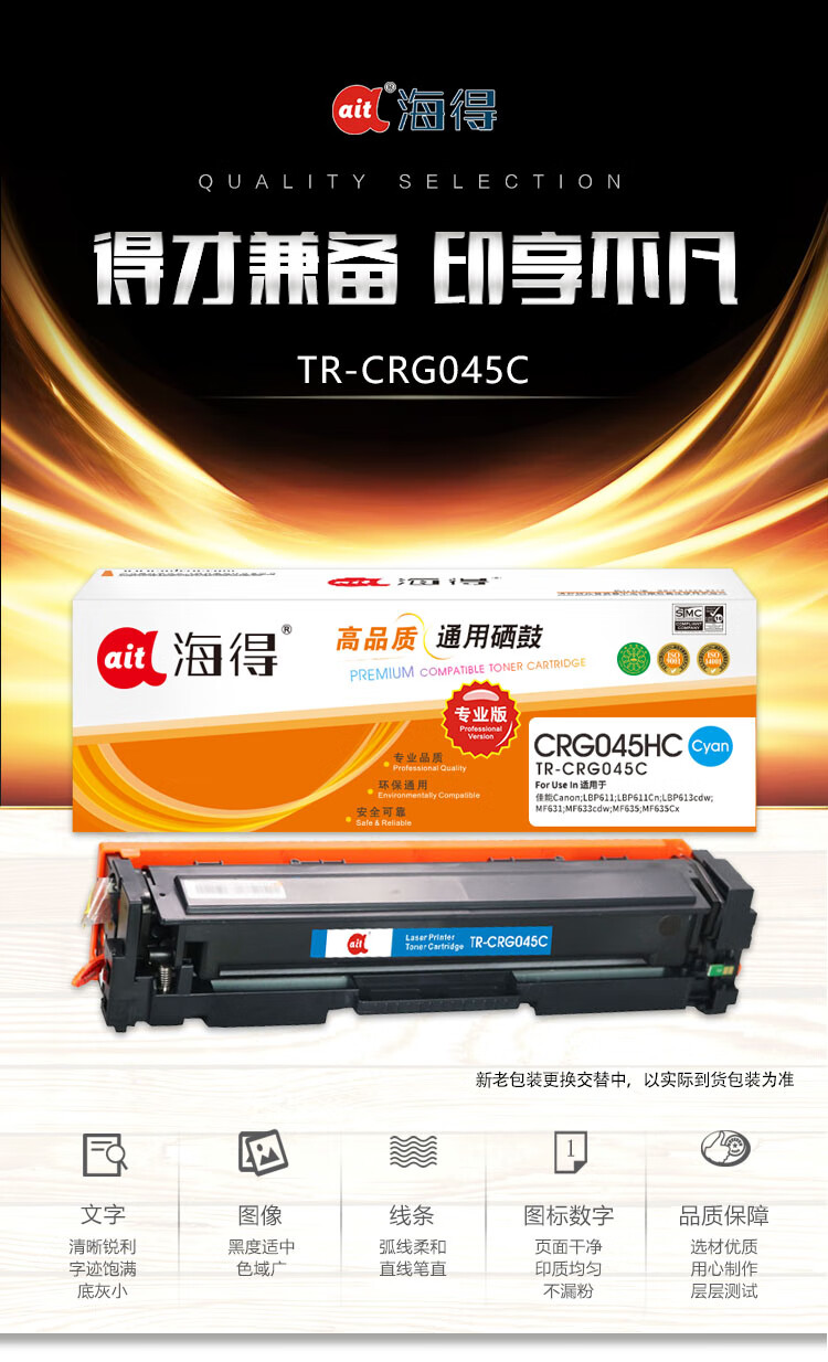海得(ait) AIT-CRG045C 专业版 打印量约2200页 适用佳能CRG045HC LBP610C LBP611Cn LBP612Cdw 硒鼓 1.00 只/支 (计价单位:支) 蓝色