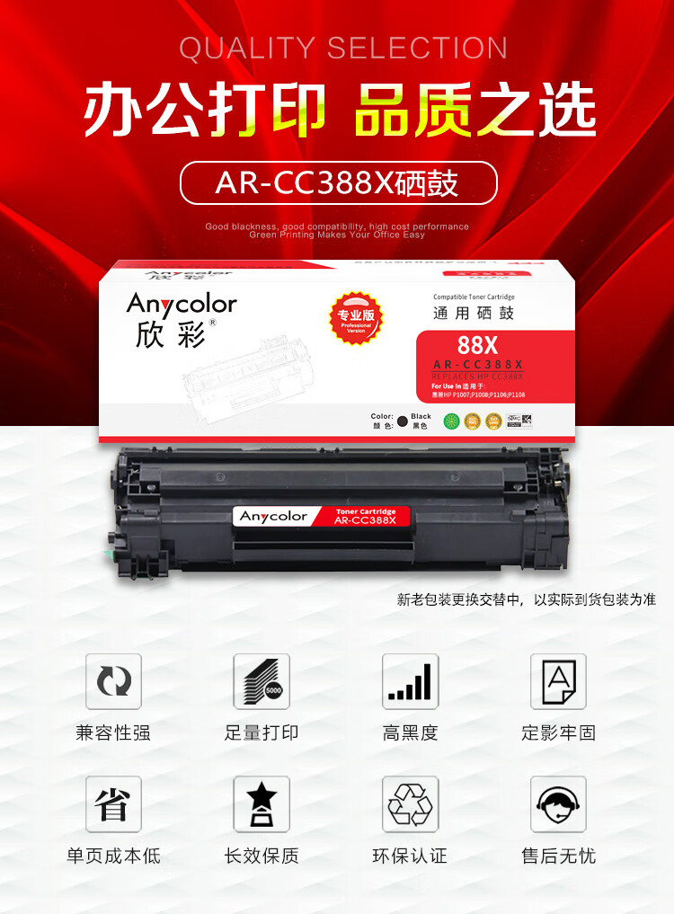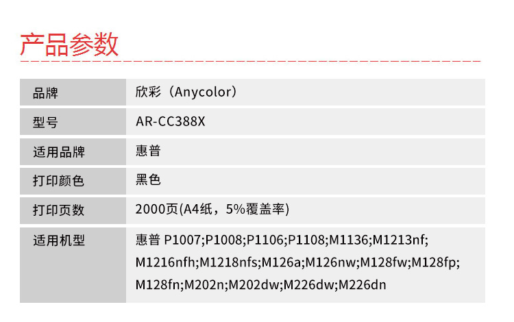 欣彩(Anycolor) AR-CC388X专业版 打印页数:2000页 适用惠普 P1007 P1008 P1106 P1108 M1136 硒鼓 (计价单位:只) 黑色