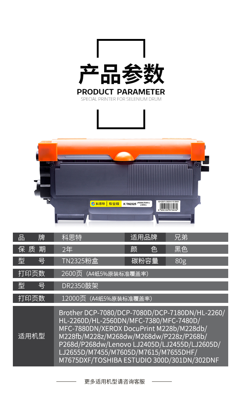 科思特 TN2325 专业版 打印量约2600页 适用联想LJ2605D/M7605D/兄弟HL2260 粉盒 1.00 只/支 (计价单位:支) 黑色