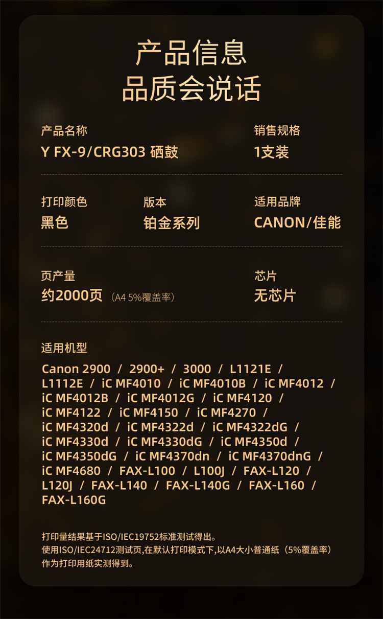 印友(YINYOU) 铂金系列 Y FX-9/CRG303 黑色硒鼓(无芯片)适用佳能 Canon 2900/3000/L1121E/L1112E 打印量:2000页 硒鼓 (计价单位:只) 黑色