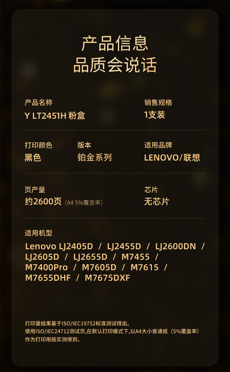 印友(YINYOU) 铂金系列 Y LT2451H 黑色粉盒(无芯片)适用联想 Lenovo LJ2600DN/LJ2605D/LJ2655D 打印量:2600页 粉盒 (计价单位:只) 黑色
