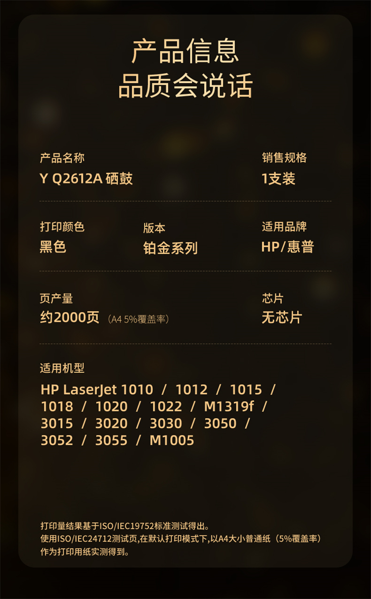 印友(YINYOU) 铂金系列 Y Q2612A 黑色硒鼓(无芯片)适用惠普 HP 1010/1012/1015/1018/1020 打印量:2000页 硒鼓 (计价单位:只) 黑色