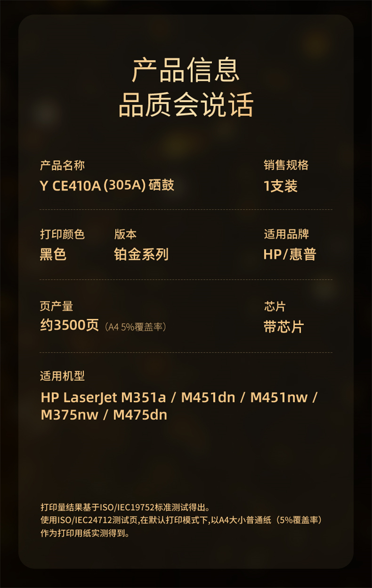印友(YINYOU) 铂金系列 Y CE410A(305A)(带芯片)适用惠普 HP M351a/M451dn/M451nw 打印量:3500页 硒鼓 (计价单位:只) 黑色