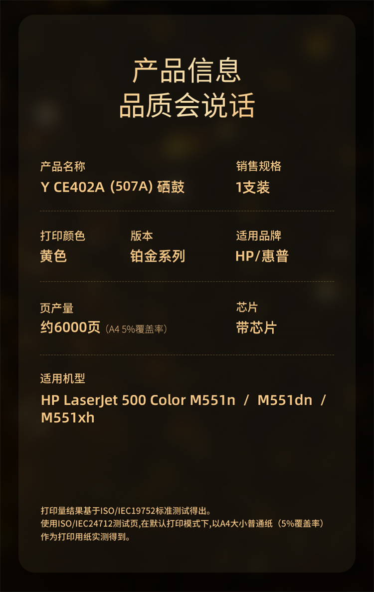 印友(YINYOU) 铂金系列 Y CE402A(507A)(带芯片)适用惠普 HP M551n/M551dn/M551xh 打印量:6000页 硒鼓 (计价单位:只) 黄色
