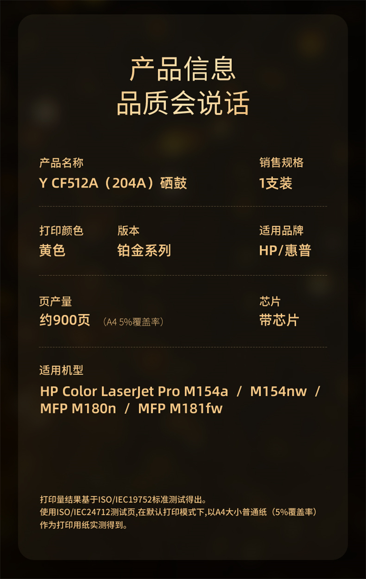 印友(YINYOU) 铂金系列 Y CF512A(204A)(带芯片)适用惠普 HP M154a/M154nw/MFP M180n 打印量:900页 硒鼓 (计价单位:只) 黄色