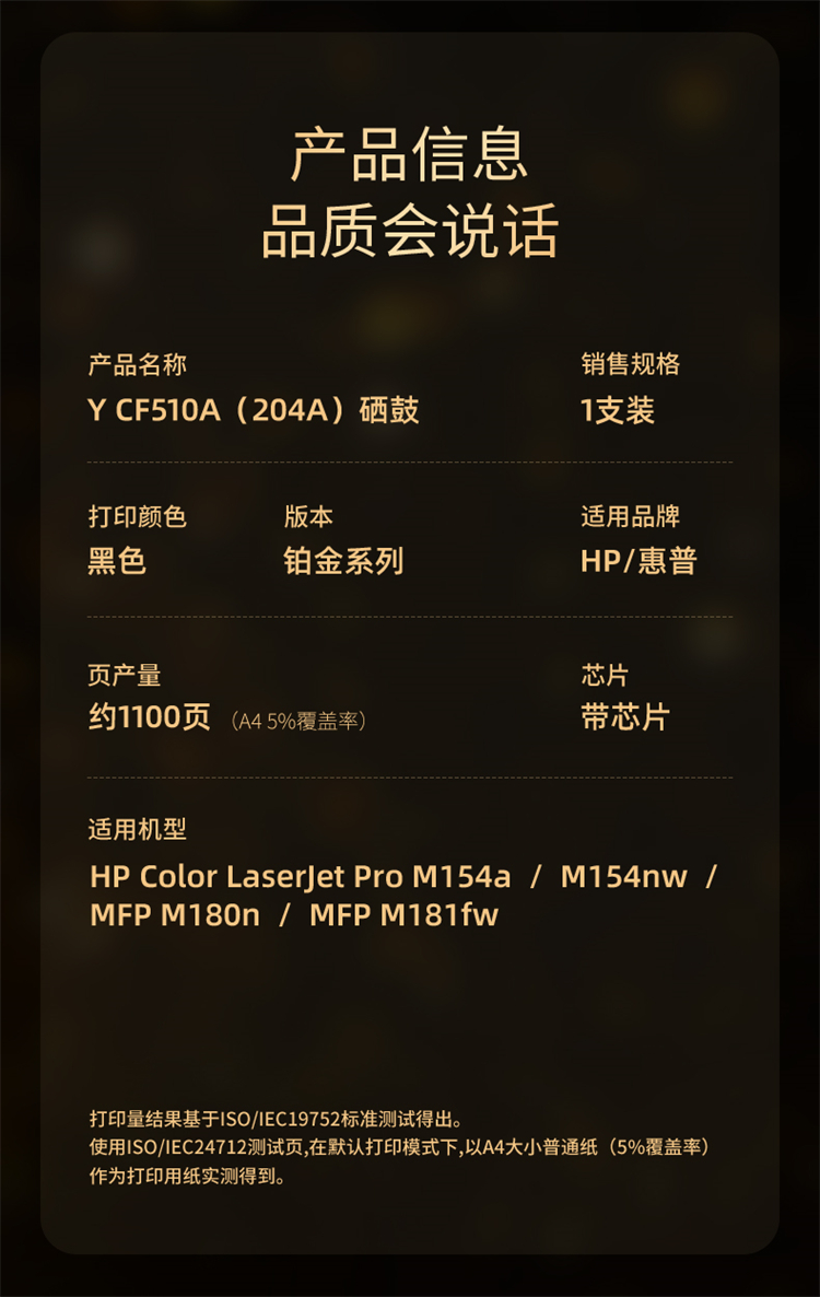 印友(YINYOU) 铂金系列 Y CF510A(204A)(带芯片)适用惠普 HP M154a/M154nw/MFP M180n 打印量:1100页 硒鼓 (计价单位:只) 黑色