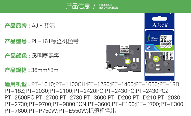 艾洁(AJ) PL-161打印量36mm*8m透明底黑字适用兄弟PT-1010;1100CH;1280;1400TZe-161标签机色带等色带 标签色带 1.00 个/只 (计价单位:只) 透明底黑字