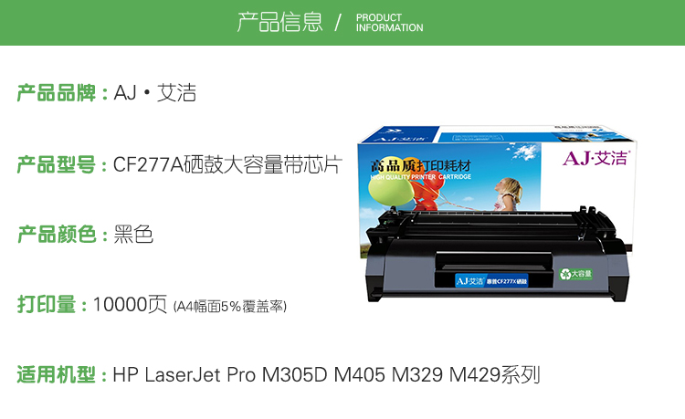 艾洁(AJ) CF277X打印量10000页大容量带芯片适用HPLaserJetProM305DM405M329M429系列打印机粉盒带芯片等硒鼓 硒鼓 (计价单位:只) 黑色