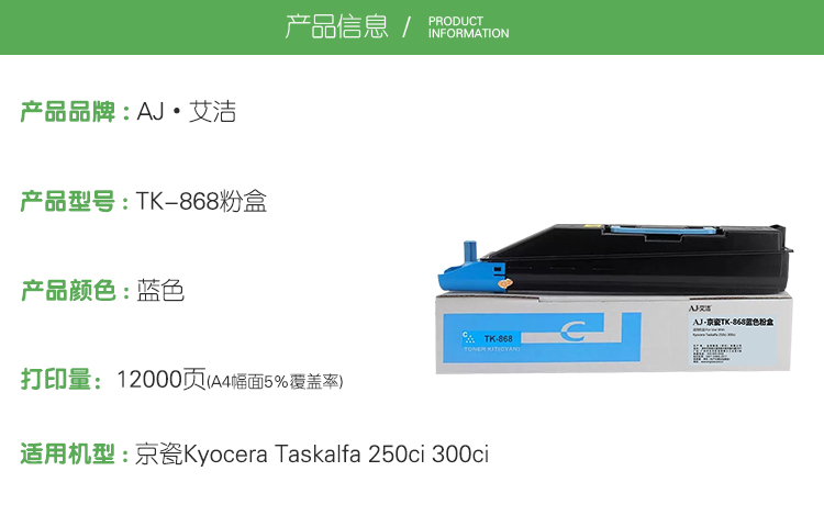 艾洁(AJ) TK-868打印量12000页适用京瓷KyoceraTaskalfa250ci300ci复合机墨粉盒等粉盒 蓝色 硒鼓 (计价单位:只) 蓝色