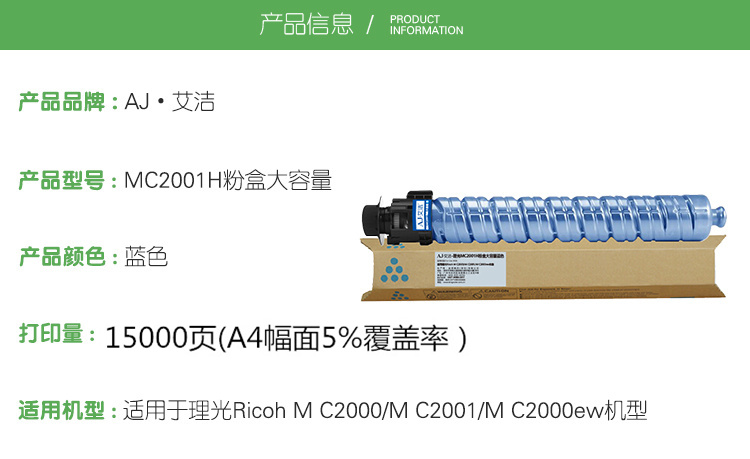 艾洁(AJ) MC2001H打印量15000页大容量适用于理光RicohMC2000/MC2001/MC2000ew机型等粉盒 蓝色 硒鼓 (计价单位:只) 蓝色