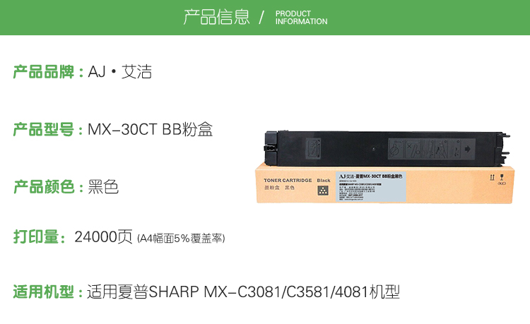 艾洁(AJ) MX-30CT BB打印量24000页适用夏普SHARPMX-C3081/C3581/4081机型等粉盒 硒鼓 (计价单位:只) 黑色