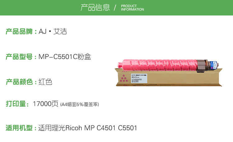 艾洁(AJ) MP-C5501C打印量17000页适用理光RicohMPC4501C5501复合机墨粉盒碳粉盒等粉盒 红色 硒鼓 (计价单位:只) 红色