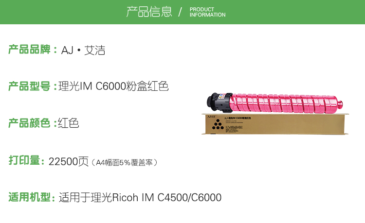 艾洁(AJ) IM C6000打印量22500页适用于理光RicohIMC4500/C6000等粉盒 红色 硒鼓 (计价单位:只) 红色