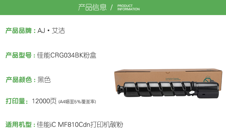 艾洁(AJ) CRG034BK打印量12000页适用佳能iCMF810Cdn打印机碳粉等粉盒 硒鼓 (计价单位:只) 黑色