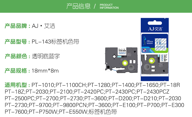 艾洁(AJ) PL-143打印量18mm*8m透明底蓝字适用兄弟PT-1010;1100CH;1280;1400TZe-143标签机色带等色带 标签色带 1.00 个/只 (计价单位:只) 透明底蓝字