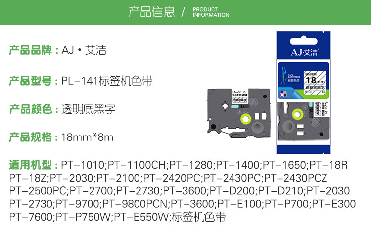 艾洁(AJ) PL-141打印量18mm*8m透明底黑字适用兄弟PT-1010;1100CH;1280;1400TZe-141标签机色带等色带 标签色带 1.00 个/只 (计价单位:只) 透明底黑字