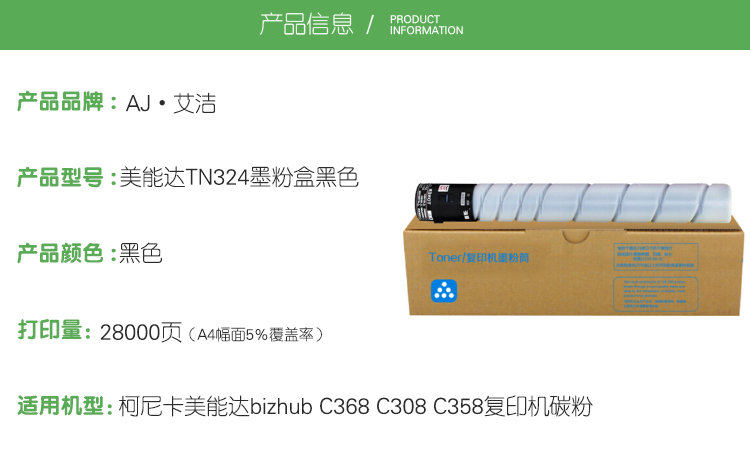 艾洁(AJ) TN324打印量28000页适用柯尼卡美能达bizhubC368C308C358复印机碳粉等粉盒 硒鼓 (计价单位:只) 黑色
