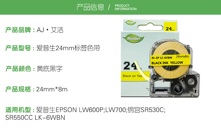 艾洁(AJ) 24mm打印量24mm*8m黄底黑字适用EPSONLW600P;LW700;锦宫SR530C;SR550CCLK-6YBP等色带 标签色带 1.00 个/只 (计价单位:只) 黄底黑字