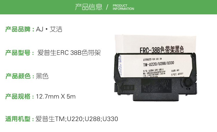 艾洁(AJ) ERC 38B 打印量12.7mm X 5m 适用爱普生TM;U220;U288;U330 色带 1.00 盒/只 (计价单位:只) 黑色