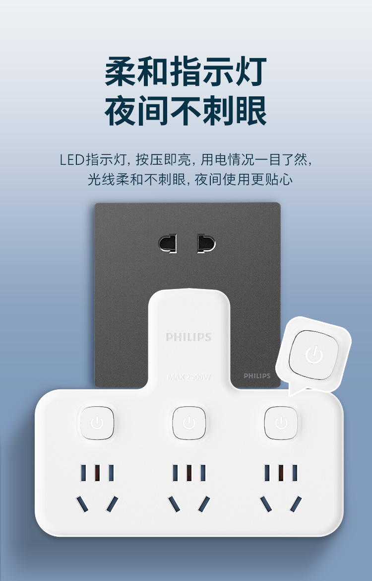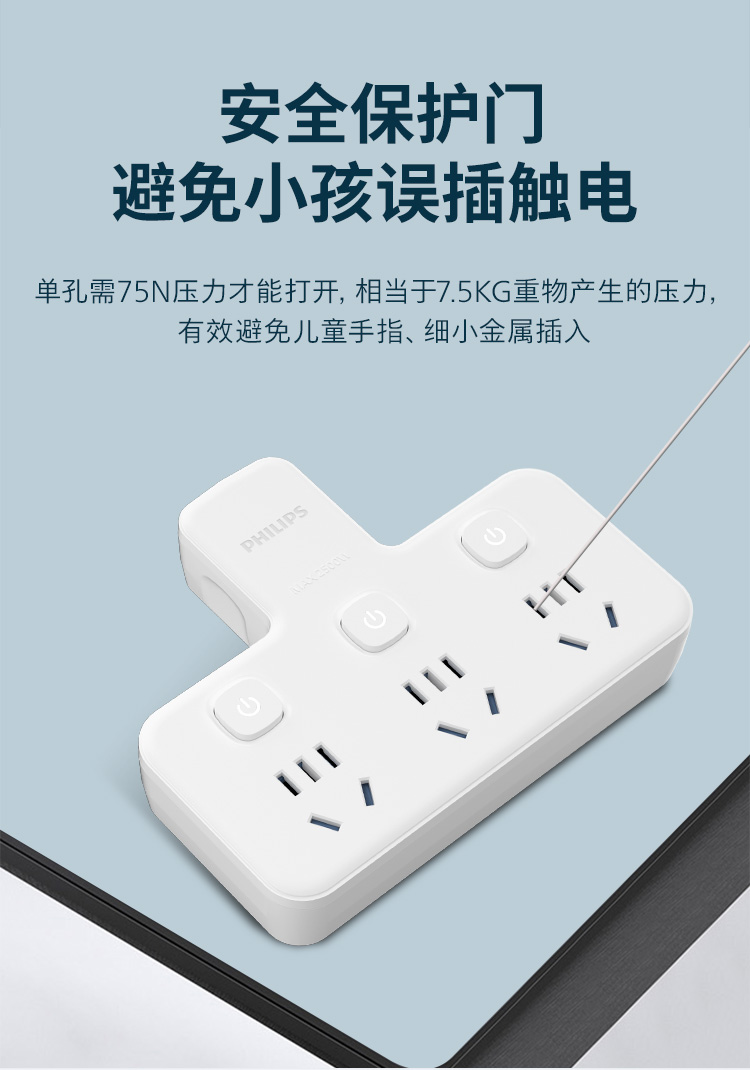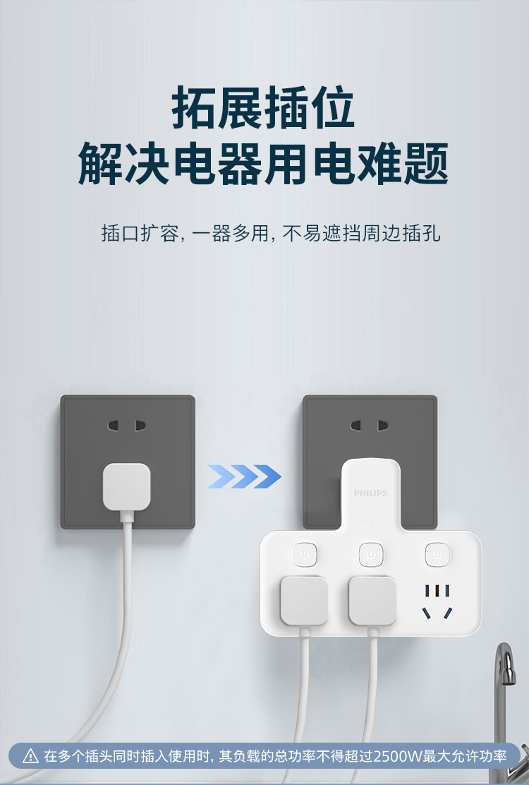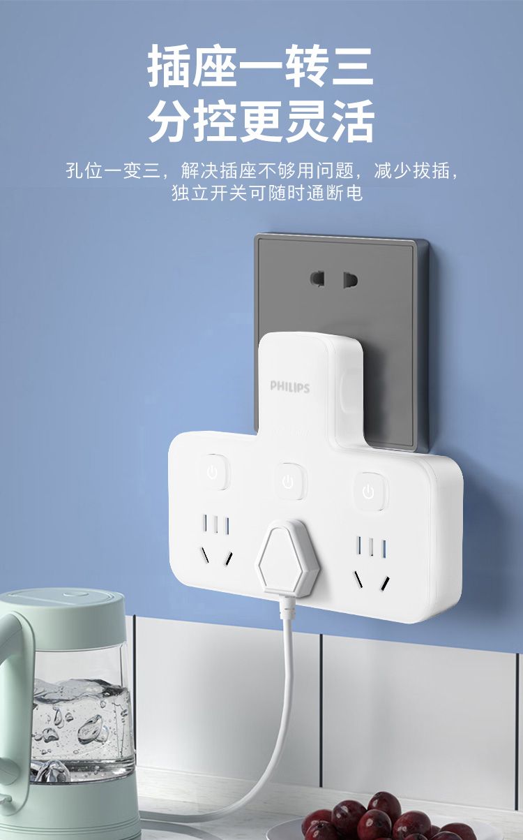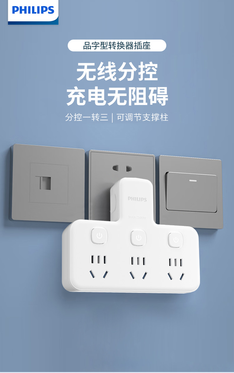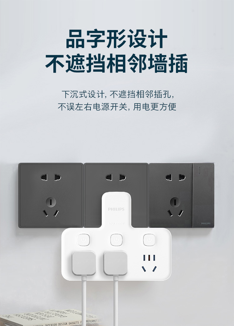 飞利浦插座排插品字形插座无线一转三位插座分控3位5孔SPB3031W/93(单位:个) 白色