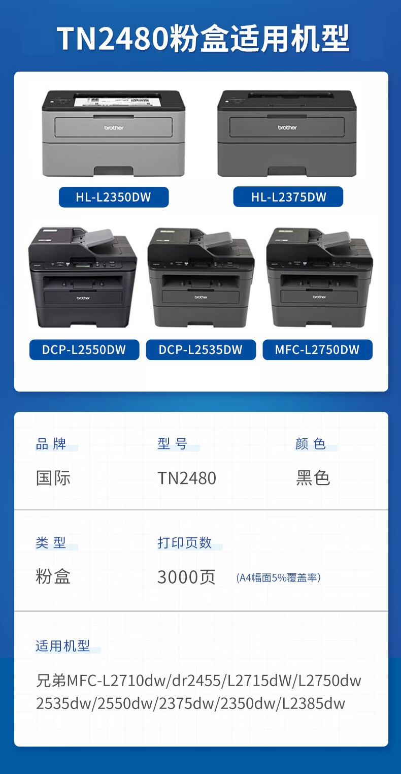 国际 TN2480粉盒 兄弟MFC-L2715DW/MFC-L2710DW/L2750DW 单位:支 黑色