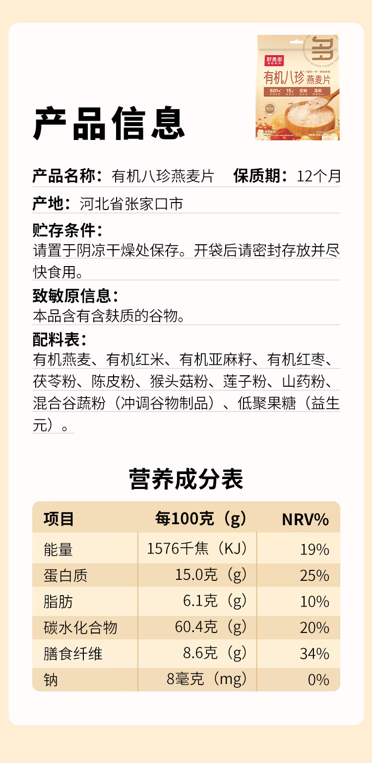 好麦多(HONlife) 有机八珍燕麦片 210g 有机八珍燕麦片 象牙色(单位:袋)