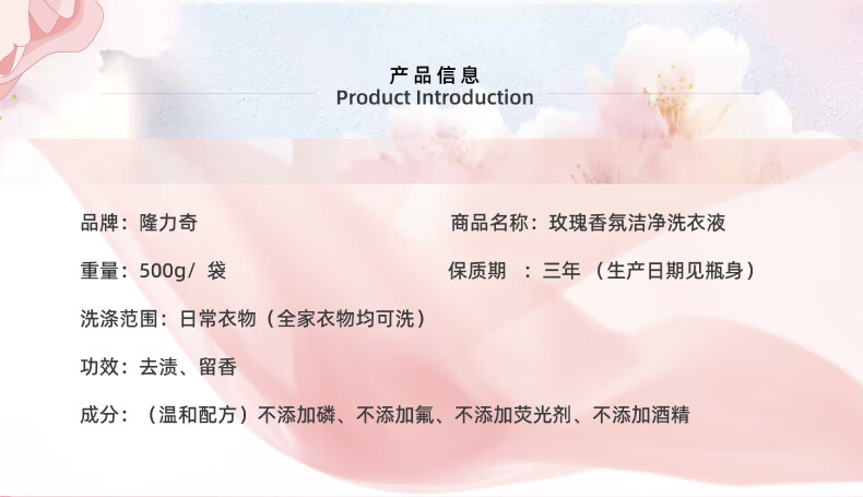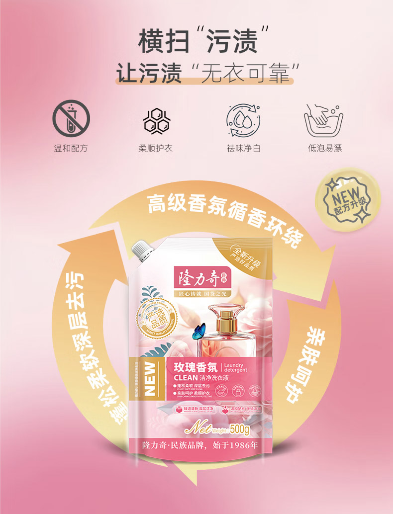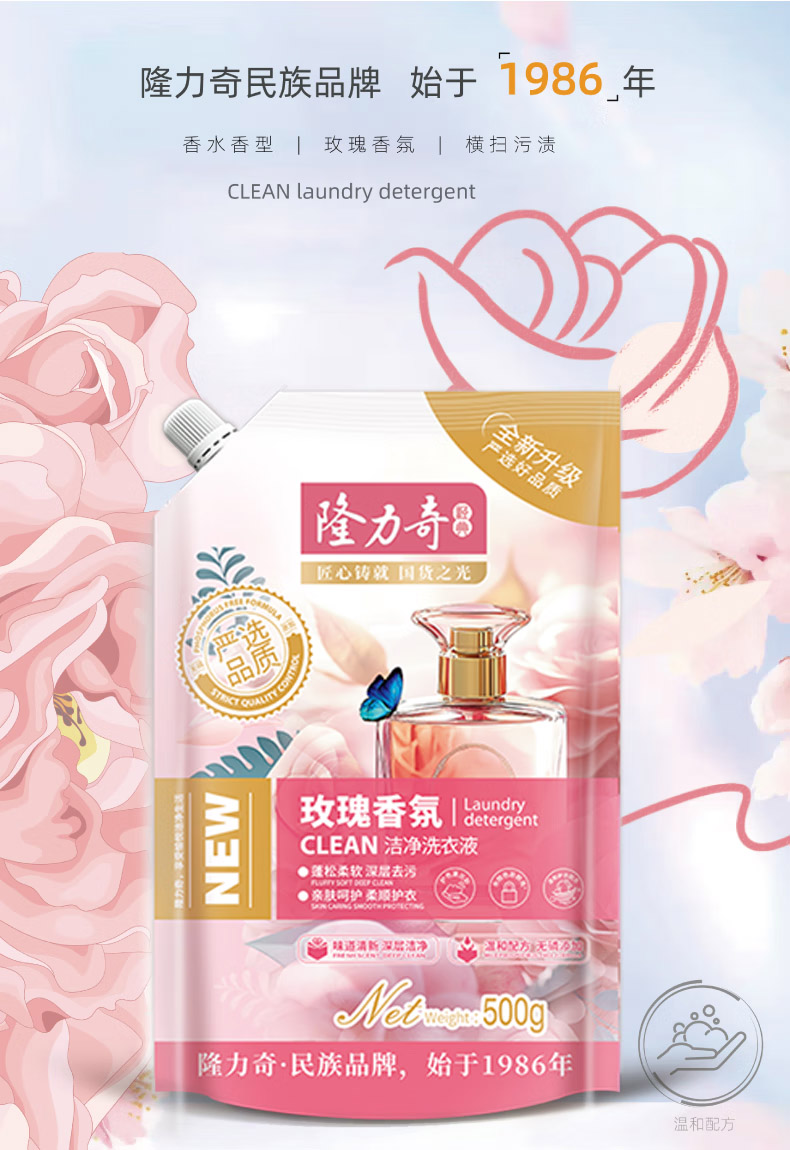 隆力奇 LLQ-8040100023 玫瑰香氛洁净洗衣液袋装500g*12袋 去污护色 留香持久 玫瑰红色(单位:箱)