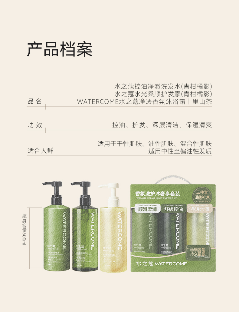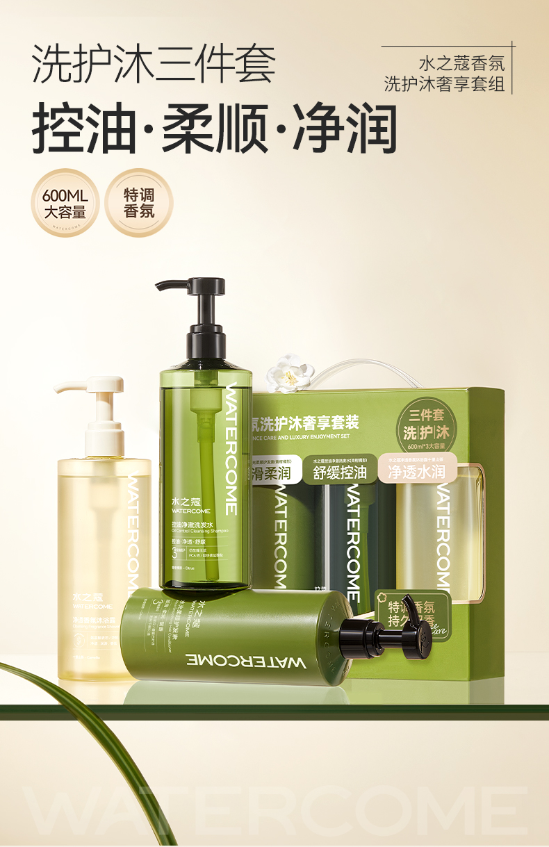 水之蔻 洗护沐 奢享套装 (洗发水600ml+护发素600ml+沐浴露600ml)*1 绿色(单位:套)