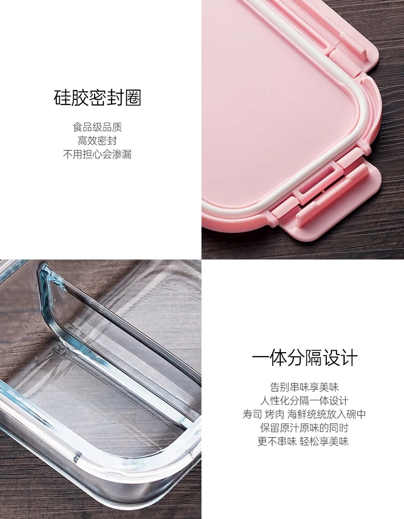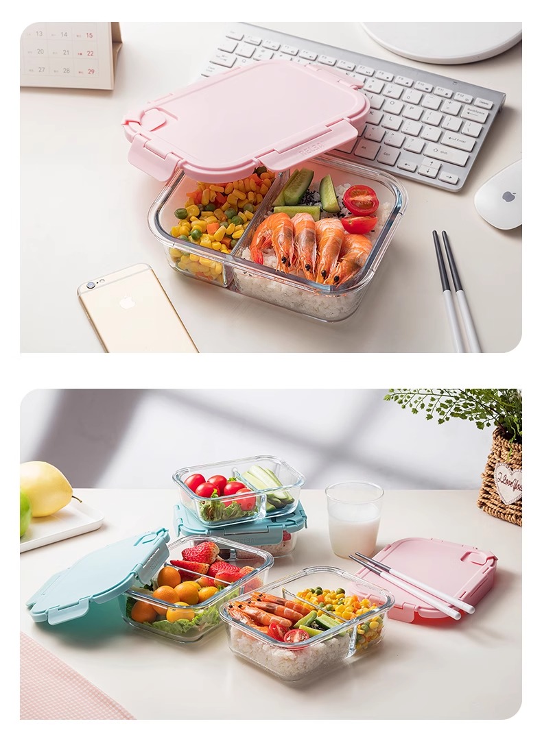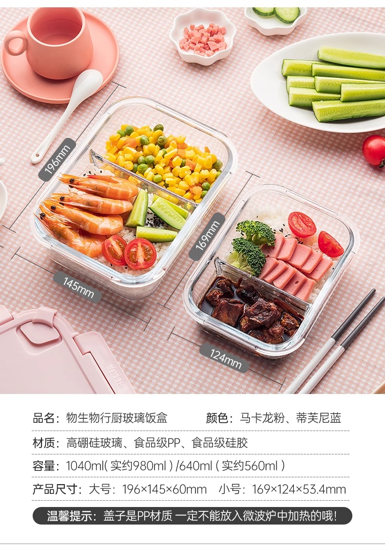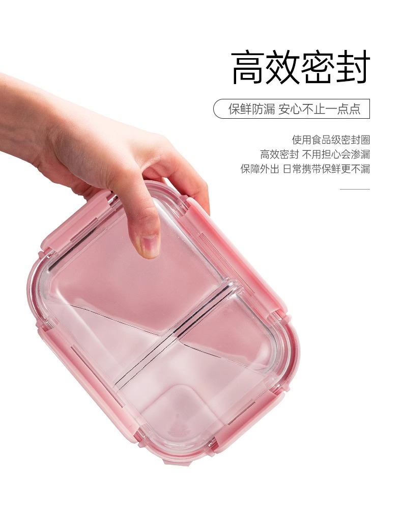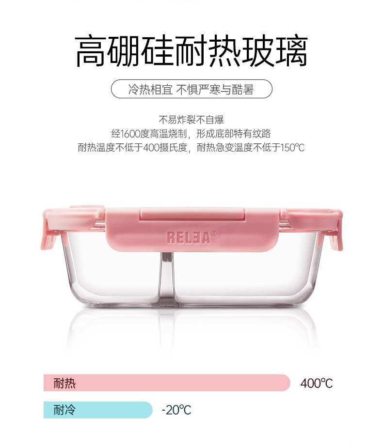 物生物(RELEA) 长方形玻璃饭盒 JV061710-1040-FS00 1040ML 粉色三分隔(单位:个)