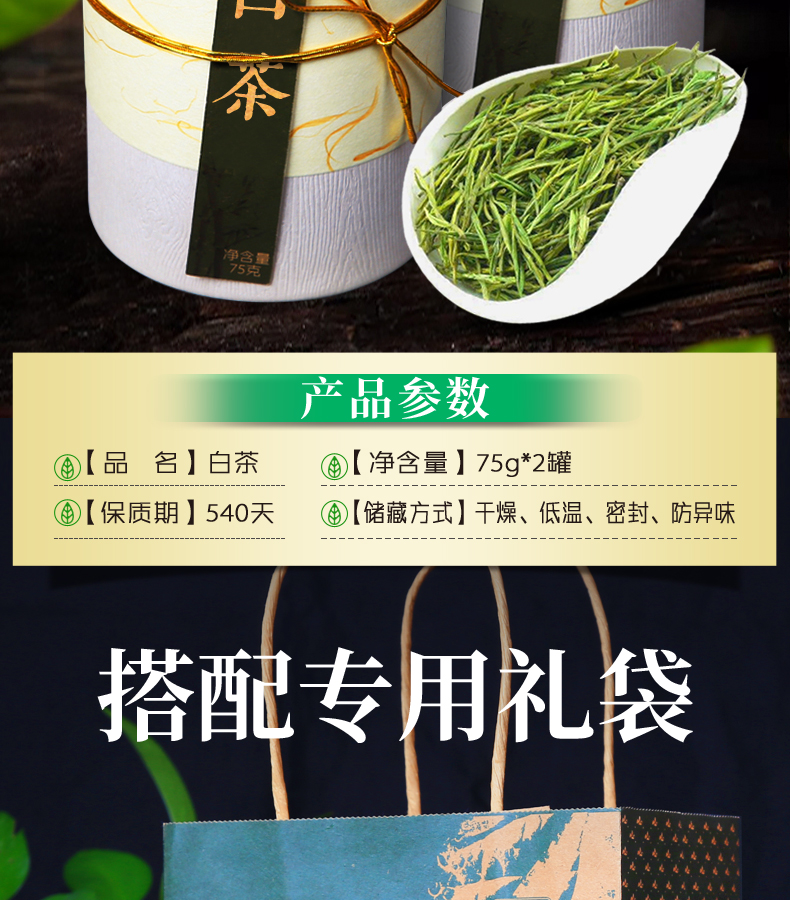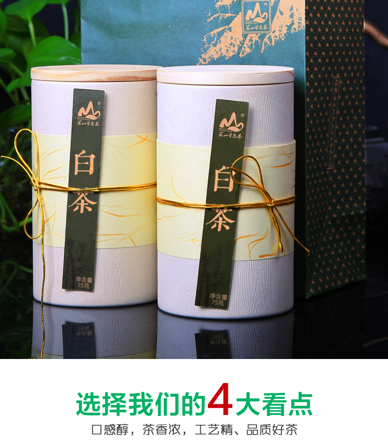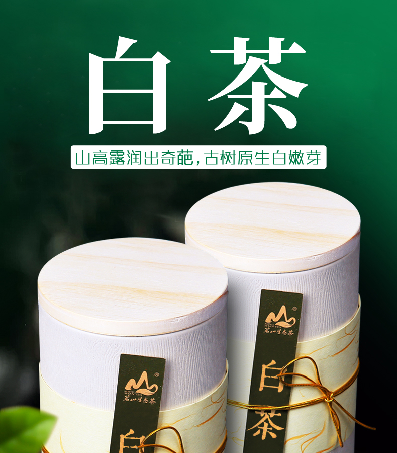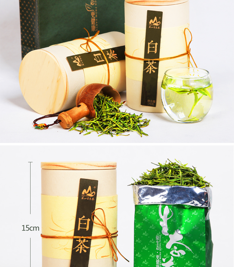 茗山生态茶 白茶明前绿茶 春毛峰茶叶 环保木罐装 75g*2共150克/2罐/份单位:组 白色