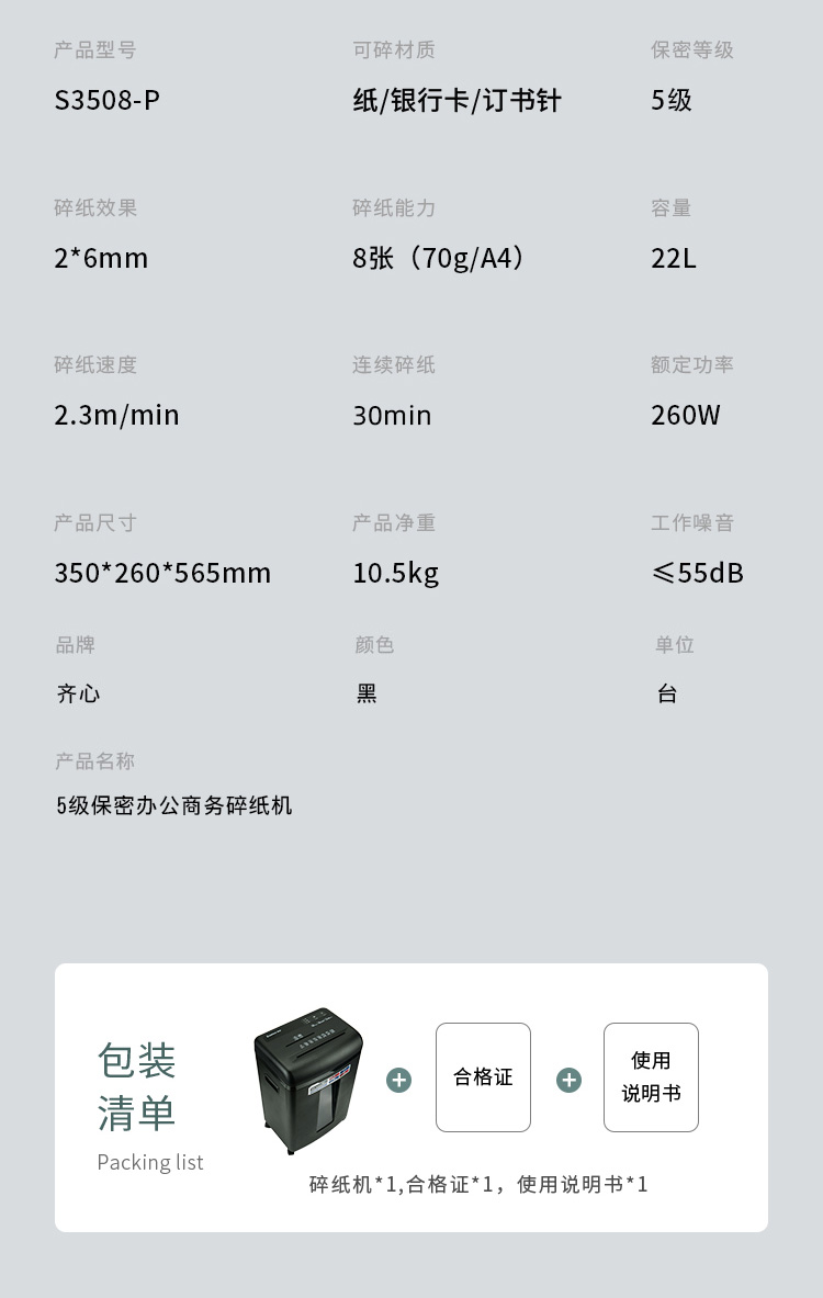 齐心(COMIX) 碎纸机 S3508-P 5级保密22L 黑色(单位:台)