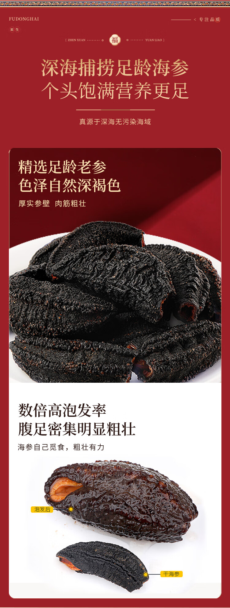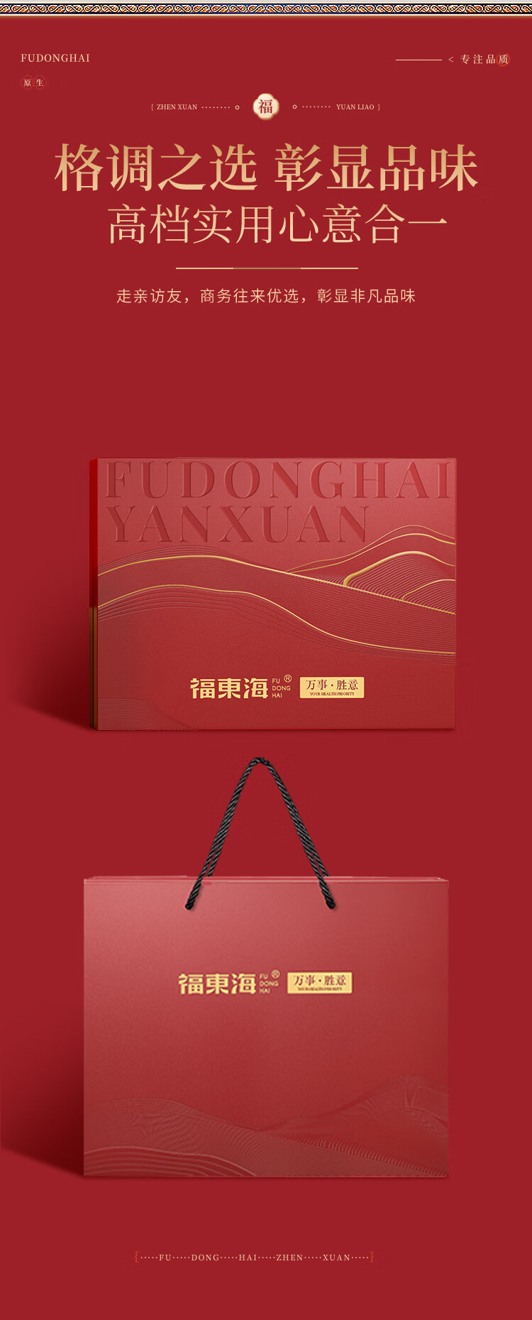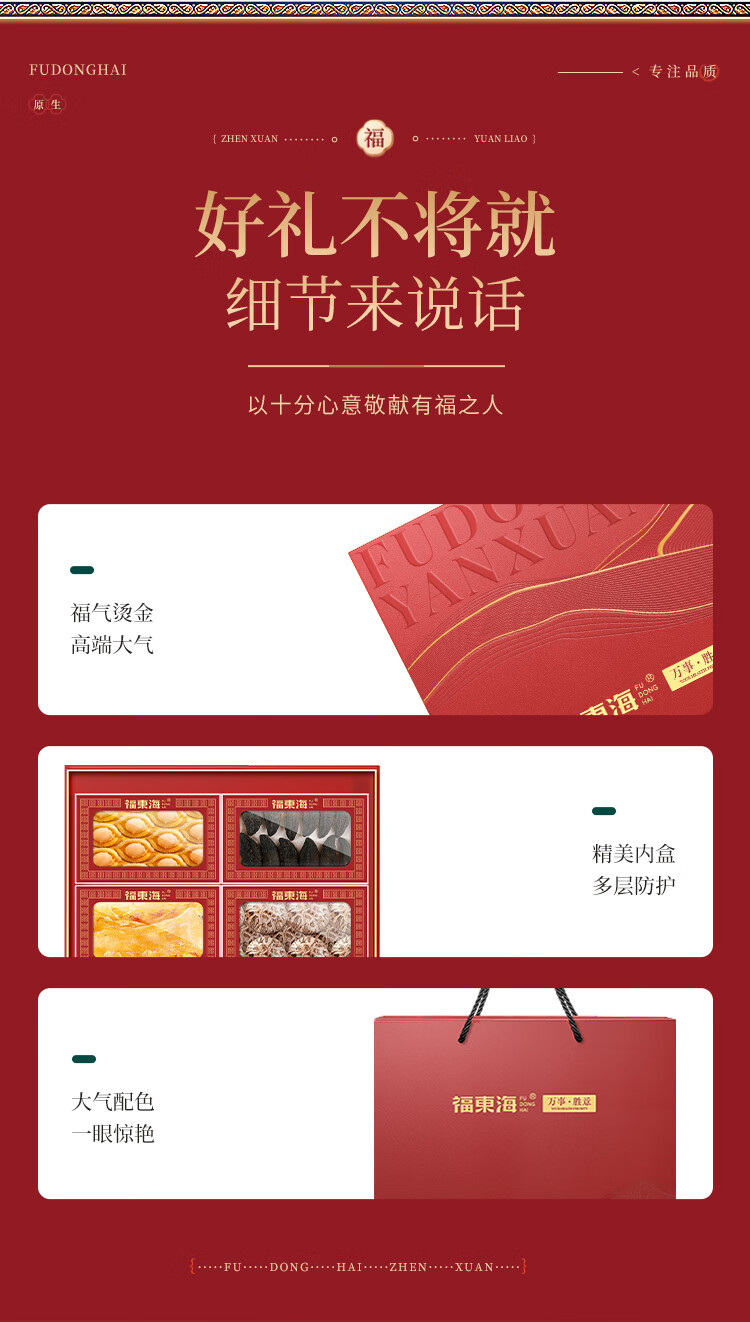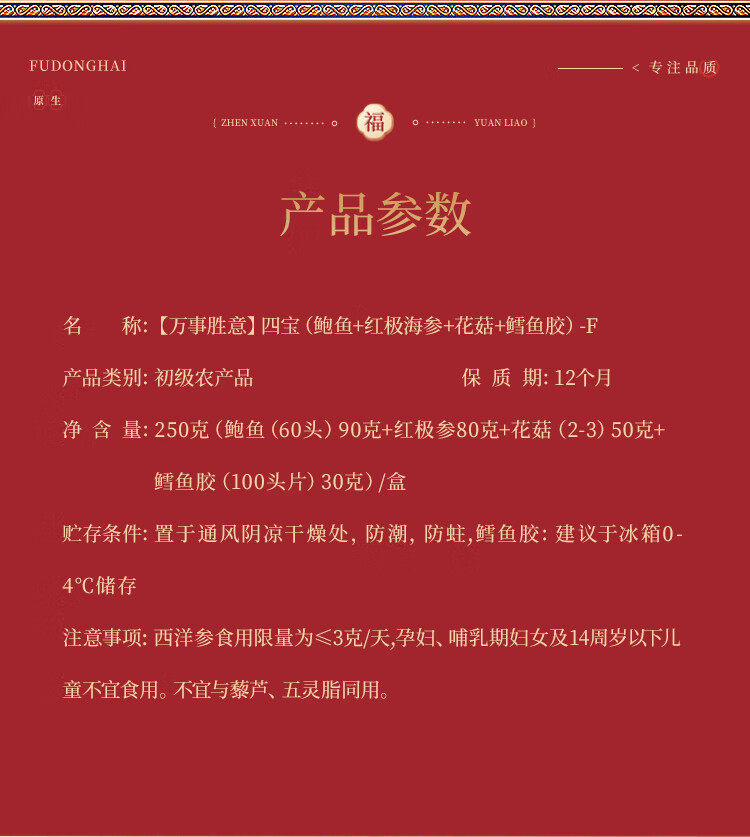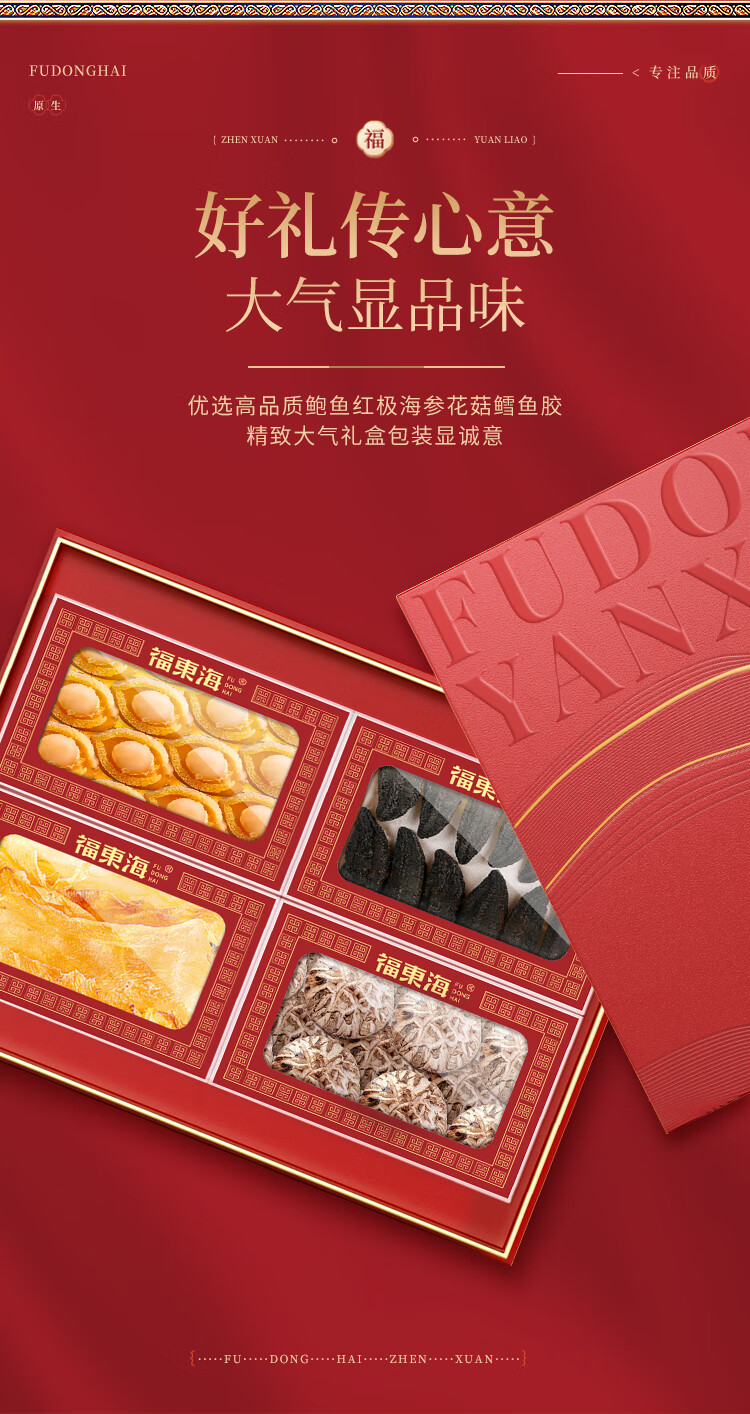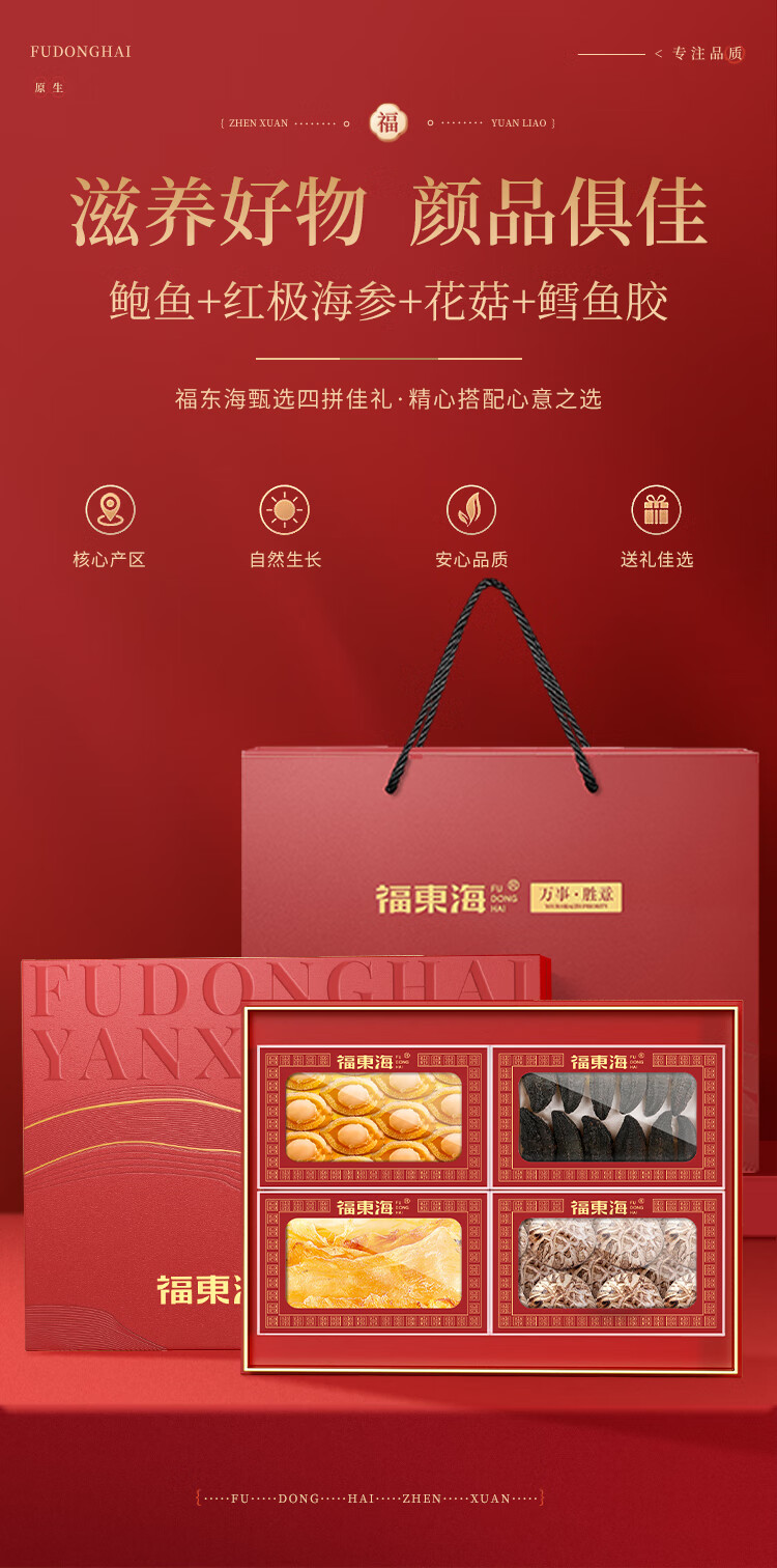 福东海(fudonghai) 万事胜意礼盒 鲍鱼 红极参 花菇 鳕鱼四拼F款 250g 红色(单位:盒)