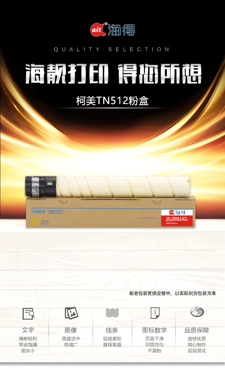 海得(ait) TF-TN512Y 适用机型:柯尼卡美能达bizhub c454 c554 复印机 打印量:25000页 粉盒 1.00 只/支 (计价单位:支) 黄色