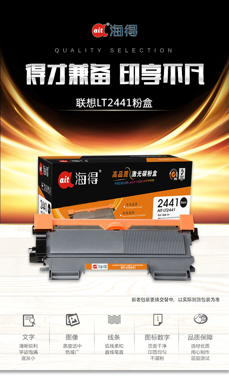 海得(ait) AIT-LT2441 专业版 适用机型:联想LJ2400 LJ2400L M7400 M7450F M3410 打印量:1500页 粉盒 1.00 只/个 (计价单位:个) 黑色