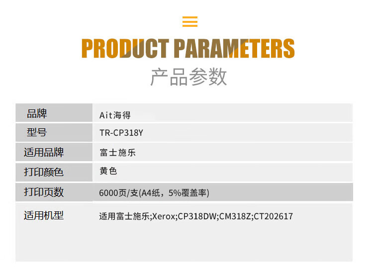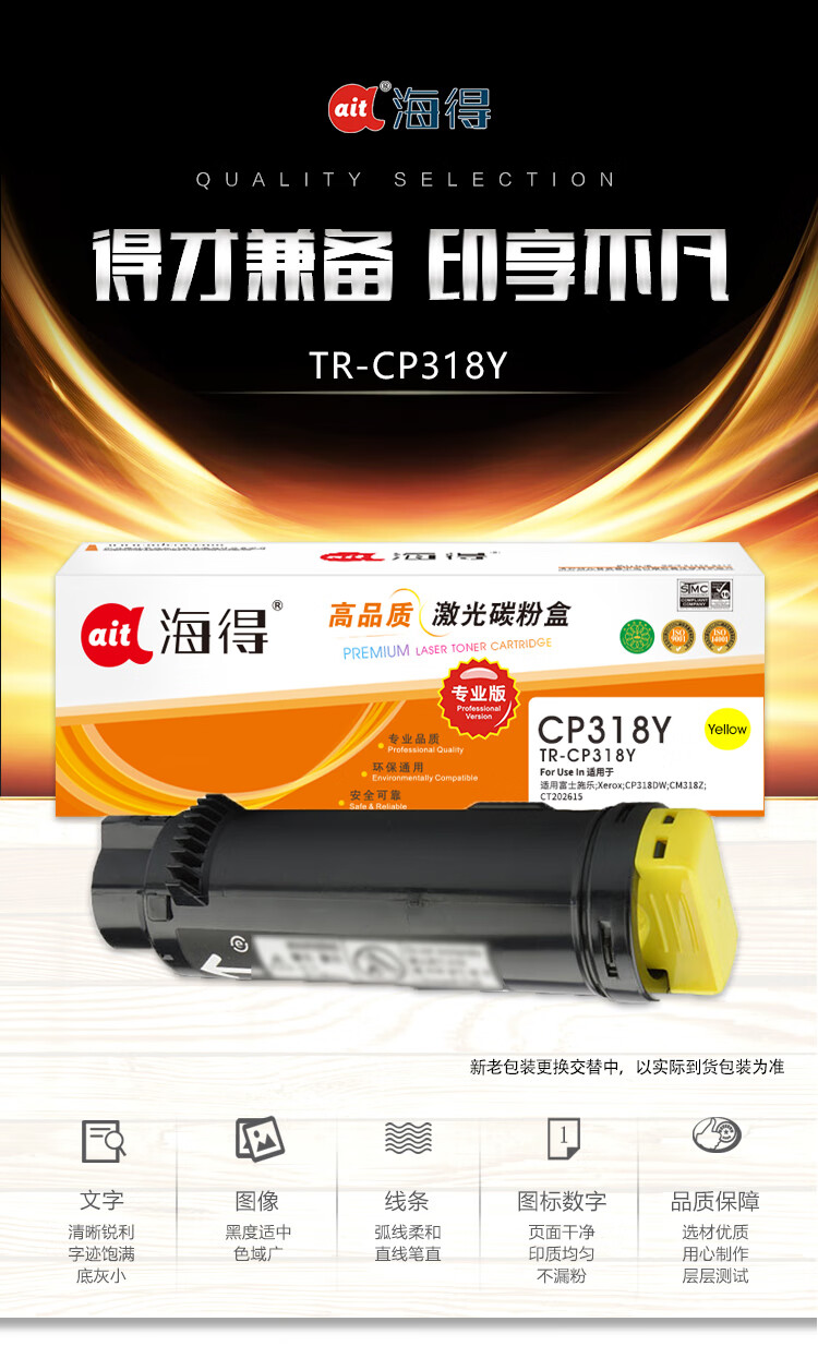 海得(ait) AIT-CP318Y 专业版 适用机型:施乐 CP318DW CM318Z CT202616 打印量:6000页 粉盒 1.00 只/盒 (计价单位:盒) 黄色