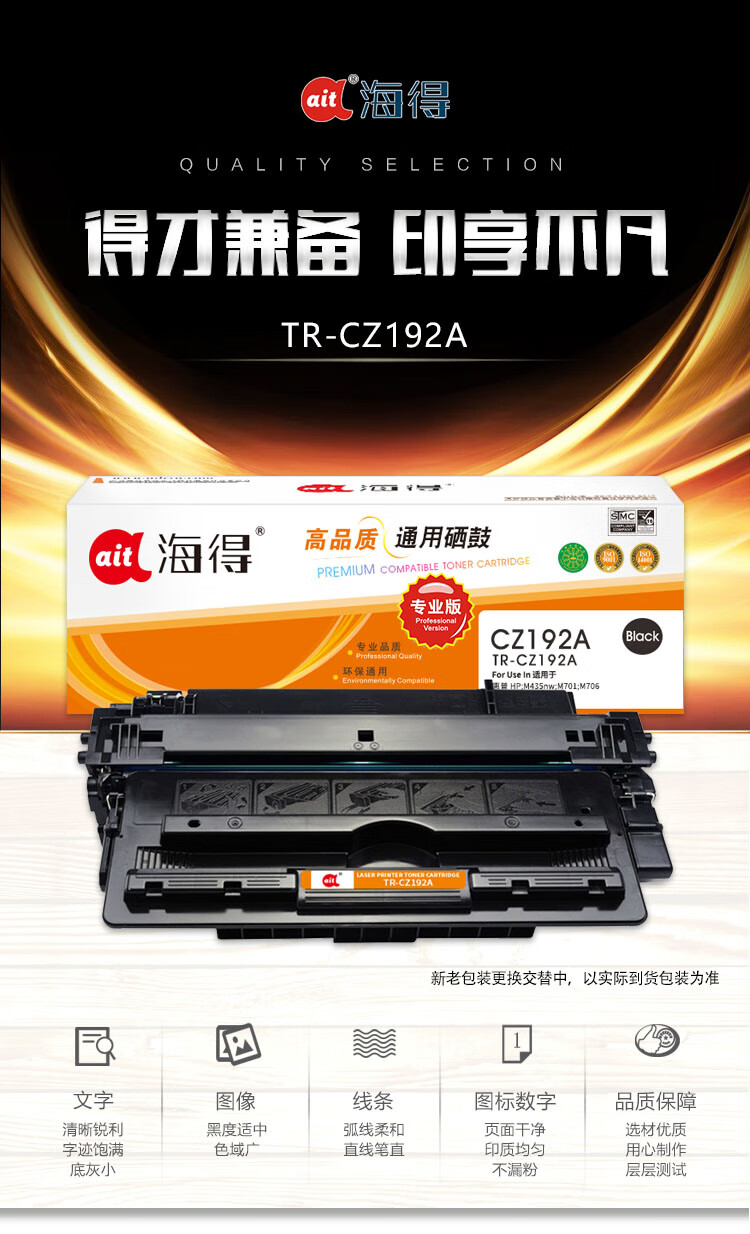海得(ait) AIT-CZ192A 专业版 适用机型:惠普 M435nw M701 M706 打印量:12000页 硒鼓 1.00 只/盒 (计价单位:盒) 黑色