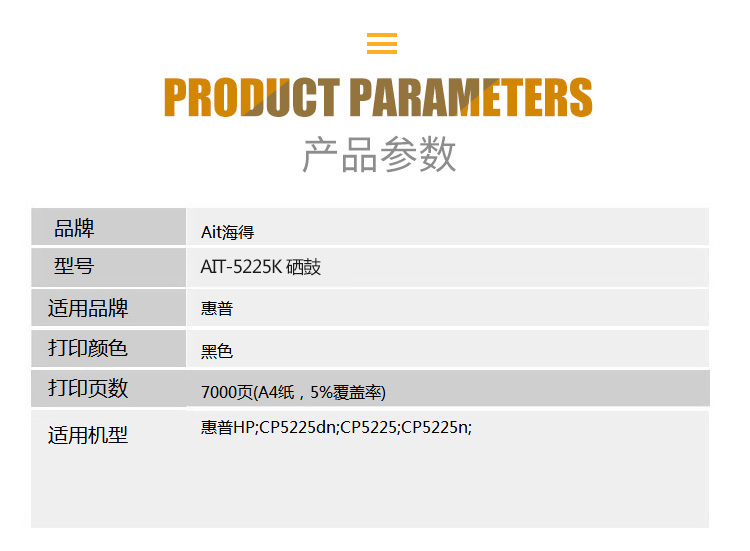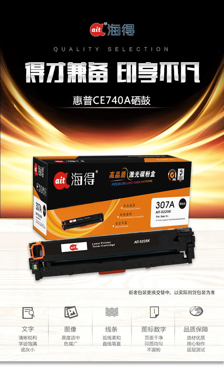 海得(ait) AIT-5225K CE740A专业版 适用机型:惠普CP5220 CP5225 CP5225n CP5225dn 打印量:7000页 硒鼓 1.00 只/盒 (计价单位:盒) 黑色