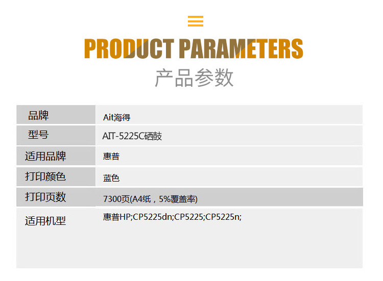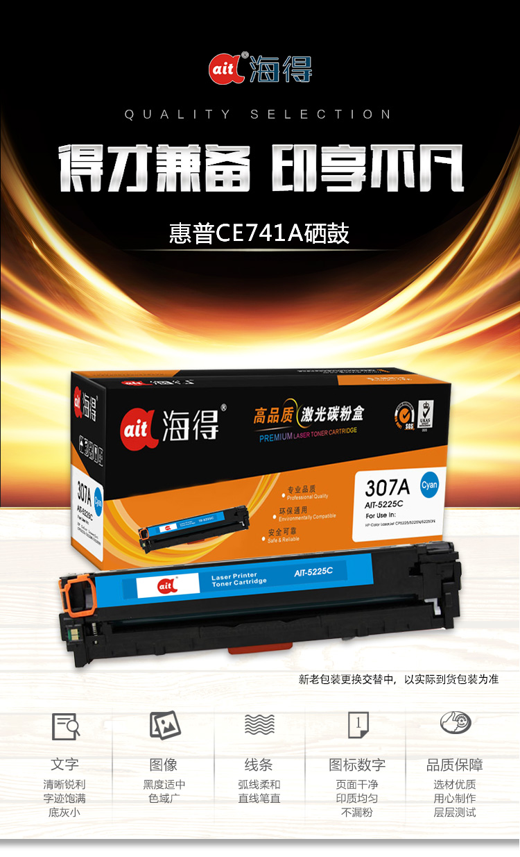 海得(ait) AIT-5225C CE741A专业版 适用机型:惠普CP5220 CP5225 CP5225n CP5225dn 打印量:7300页 硒鼓 1.00 只/盒 (计价单位:盒) 蓝色