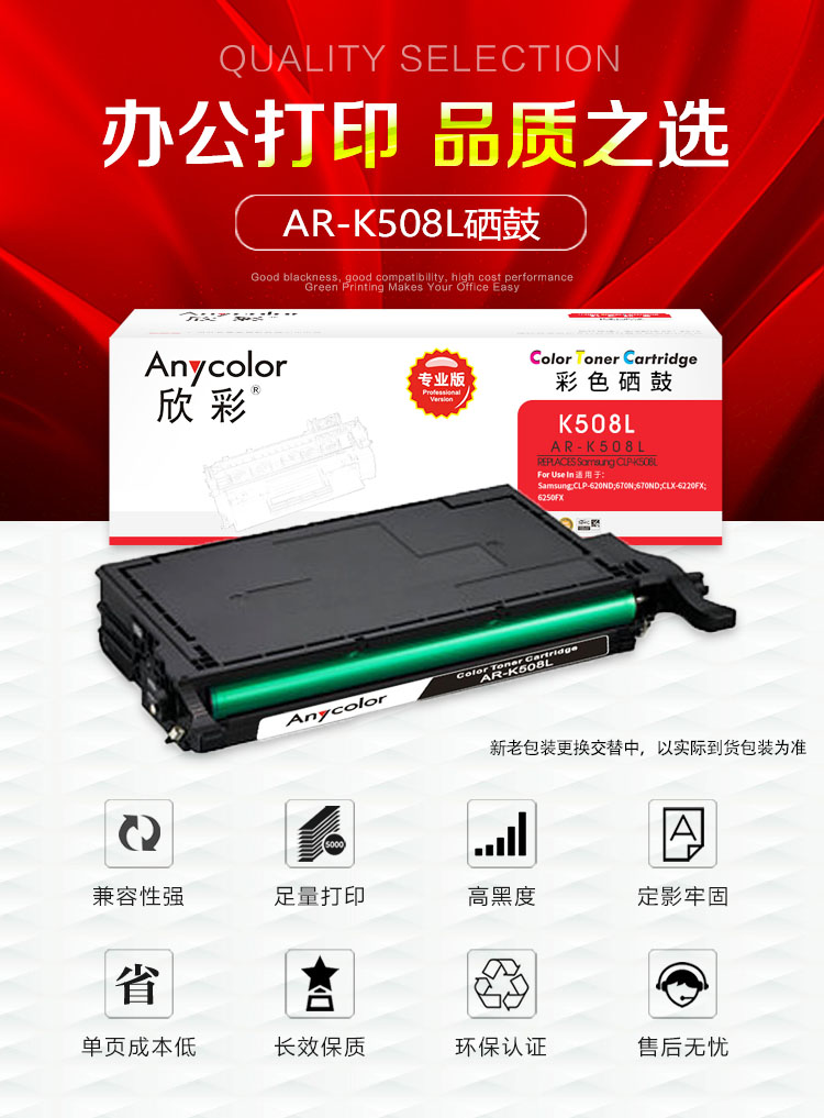 欣彩(Anycolor) AR-K508L 专业版 打印量:5500页 适用三星CLP-620ND/670N/ND/CLX-6220FX/6250FX 硒鼓 (计价单位:只) 黑色
