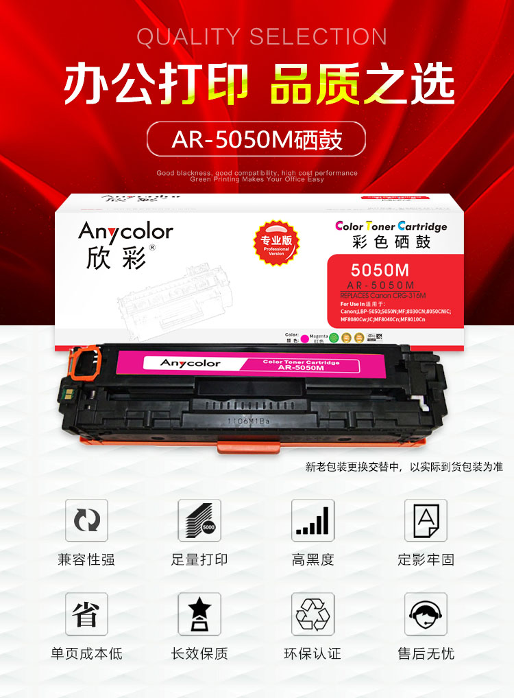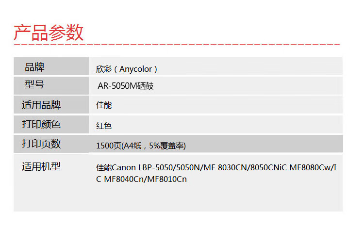 欣彩(Anycolor) AR-5050M 专业版 打印量:1500页 适用佳能LBP5050/LBP5050N/HP/M276n/M276nw/CP1215 硒鼓 (计价单位:只) 红色