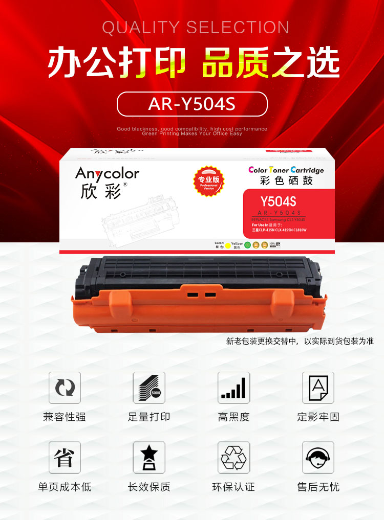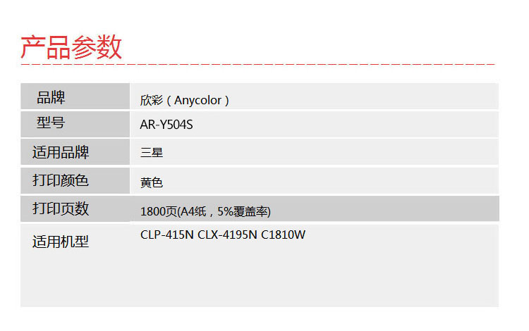欣彩(Anycolor) AR-Y504S 1800页 适用三星 CLP-415N 粉盒 1.00 只/支 (计价单位:支) 黄色